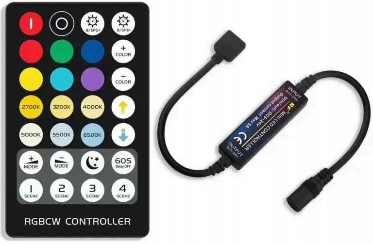 ZESTAW kontroler + pilot 28 przycisków RF LED RGB+CCT 5-24V 6A Sterownik RGB+CCT RF jest rozbudowanym urządzeniem za pomocą którego możemy sterować taśmami LED RGB+CCT. Sterowanie odbywa się za pomocą fal radiowych. Urządzenie pozwala na szybki wybór kolorów z palety RGB, możemy również zmieniać barwę od ciepłej do zimnej, kontrolować jasność świecenia, szybkość, itp. Dane techniczne: Napięcie wejściowe: DC 5-24V Natężenie: 6A Moc wyjściowa: 5V - 30W, 12V - 72W, 24V - 144W Typ sterowania: RF radiowy Gwarancja: 24 miesiące