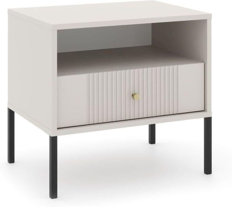 Nowoczesny stolik nocny szafka nocna do sypialni z szufladą kaszmir Iseo 54 cm metalowe nogi złoty uchwyt MDF ryfle elegancka Szafka nocna Iseo kaszmir, o szerokości 54 cm, to elegancki i praktyczny mebel idealny do każdej sypialni. Wykonana z wysokiej jakości materiałów, zapewnia trwałość i stylowy wygląd. Wyposażona w otwartą półkę oraz zamykaną szafkę, oferuje dużo miejsca na przechowywanie książek, lampki nocnej i innych niezbędnych przedmiotów. Jej nowoczesny design, beżowy kolor i subtelne detale doskonale komponują się z różnymi stylami wnętrz, dodając im nowoczesnego charakteru. Szafka nocna Iseo I to doskonały wybór dla osób ceniących estetykę i funkcjonalność w jednym. Wymiary szerokość - 54 cm wysokość - 50,5 cm głębokość - 39 cm Materiał wykonania korpus - płyta wiórowa melaminowana 16 mm - kaszmir front - płyta MDF 16 mm - kaszmir obrzeże - okleina ABS tył - płyta HDF Informacje dodatkowe szuflada frezowany front nowoczesny design solidna oraz trwała konstrukcja meble do samodzielnego montażu nogi oraz uchwyty wykonane są z metalu NA INNYCH NASZYCH AUKCJACH PREZENTUJEMY POZOSTAŁE BRYŁY Z KOLEKCJI ISEO