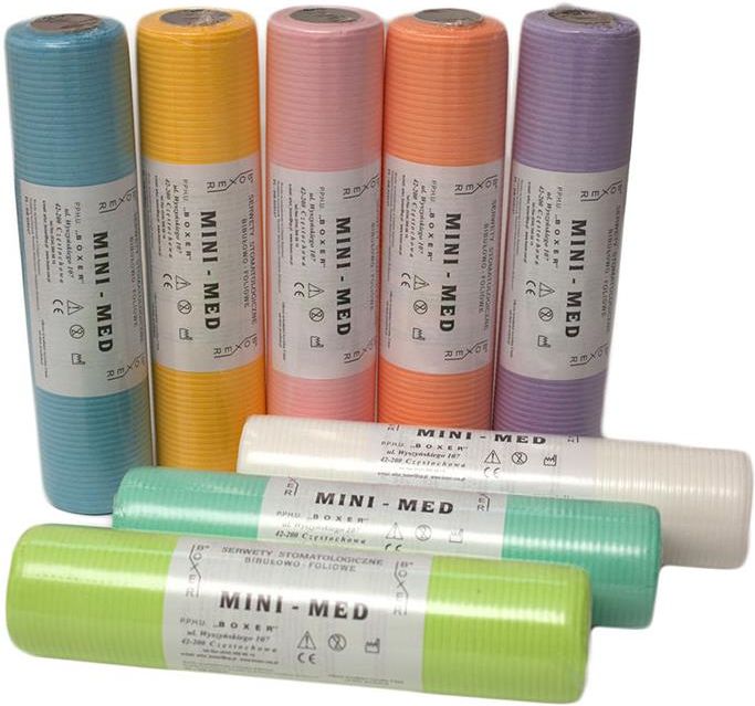 Profesjonalna serweta stomatologiczna w rozmiarze 33 cm x 48 cm na rolce. Jednorazowe serwety stomatologiczne wykonane są z mocnej, dwuwarstwowej kolorowej bibuły i wzmocnionej folią PE. Oderwanie pojedynczej serwety umożliwia perforacja. Serwety nawijane są po 40 sztuk na rolce.