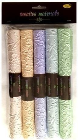 Apart Symphony 25x35 cm a 5 ark kol miks. Naturalny , ręcznie czerpany , barwiony w masie karton o gramaturze 200 , z wytłoczonym ornamentem kwiatowym. Powierzchnia lekko błyszcząca perłowo-metaliczna Wymiary: 318x176 mm Opakowanie: blister