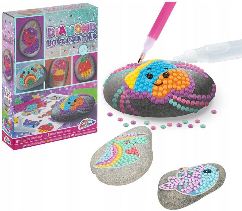 Diamentowy obraz naskalny 3 skały Diamentowe brokatowe malowanie Zestaw Diamond Rock Painting – Malowanie Diamentami na Kamieniach Zestaw kreatywny do malowania kamieni diamentami Zestaw Diamond Rock Painting to innowacyjna propozycja dla dzieci i dorosłych, która łączy malowanie kamieni z aplikacją kolorowych diamentów. Zestaw zawiera kamienie, różnokolorowe diamenty, aplikator i klej, co umożliwia stworzenie unikalnych dekoracji na kamieniach, które zachwycą błyszczącymi detalami. Każdy kamień może zostać ozdobiony na wiele sposobów, a dołączone wzory inspirują do kreatywnej zabawy, rozwijając wyobraźnię i zdolności manualne. Błyszczące wzory na kamieniach Dzięki 9 różnym kolorom diamentów, każde dziecko może tworzyć bogate w detale i kolory wzory. Zestaw zawiera także arkusz gotowych motywów, który pozwala na szybkie i łatwe tworzenie dekoracji bez konieczności samodzielnego projektowania. Błyszczące diamenty nadadzą kamieniom wyjątkowego, magicznego wyglądu – idealnego do dekoracji pokoju czy prezentów dla bliskich. Zawartość zestawu Zestaw Diamond Rock Painting jest kompletny i gotowy do użycia. W jego skład wchodzi: 3 kamienie – przygotowane do ozdabiania, 9 kolorów diamentów – zapewniających szeroki wachlarz barw, 1 arkusz wzorów – inspirujący do tworzenia różnorodnych kompozycji, tacka – ułatwiająca wybieranie i organizację diamentów, aplikator – do precyzyjnego nakładania diamentów, suchy klej i tubka kleju – zapewniające trwałe mocowanie diamentów na powierzchni kamieni