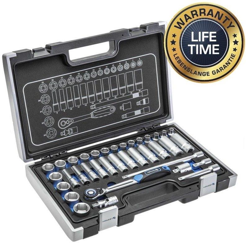 Zestaw narzędzi, 36 szt. Hogert HT1R465 Hgert Technik oferuje produkty dedykowane wielu branżom specjalistycznym. W ich ofercie znajduje się również asortyment niezwykle przydatny w warsztatach samochodowych. Ich najnowszym zestawem jest zestaw HT1R465, który świetnie uzupełnia wyposażenie profesjonalnego warsztatu, ale również w warsztacie przydomowym będzie niezwykle użyteczny. Zestaw składa się z nasadek, końcówek wkrętakowych oraz akcesoriów 3/8, w sumie to aż 36 elementów. Klucze nasadowe lepiej obejmują śrubę i są także znacznie bardziej wytrzymałe od swoich płaskooczkowych rywali. Ale to, co jest najważniejsze, to to, że takie nasadki mają bardzo szerokie zastosowanie. Postaw na pewność i niezawodność, postaw na zestaw narzędzi Hogert HT1R465 Zestaw 36 nasadek i końcówek Hogert to, odporne na odkształcenia narzędzia wykonane ze stali stopowej chromowo-wanadowej (CrV), natomiast końcówki wkrętakowe ze stali S2. Mechanizm zapadkowy grzechotki posiada 72 zęby i wykonany został ze stali stopowej chromowo-molibdenowej (CrMo). Dzięki takiej stali narzędzia mogą pracować z dużym obciążeniem. Wszystkie te nasadki w połączeniu z popularną grzechotką tworzą zgrany zespół, który potrafi poradzić sobie nawet z tymi trudno dostępnymi nakrętkami. Narzędzia umieszczono w walizce z metalowymi zamkami i zawiasami, wnętrze walizki zostało wykonane z pianki technicznej. Dzięki temu narzędzia nie przesuwają się podczas transportu. Zawartość zestawu Nasadki sześciokątne: 6, 7, 8, 9, 10, 11, 12, 13, 14, 15, 16, 17, 18, 19, 20, 21, 22, 24 mm Nasadki sześciokątne długie: 8, 9, 10, 11, 12, 13, 14, 15, 16, 17, 18, 19 mm Grzechotka 3/8" Przedłużki: 43, 100, 200 mm Przegub uniwersalny 3/8" Adapter przesuwny
