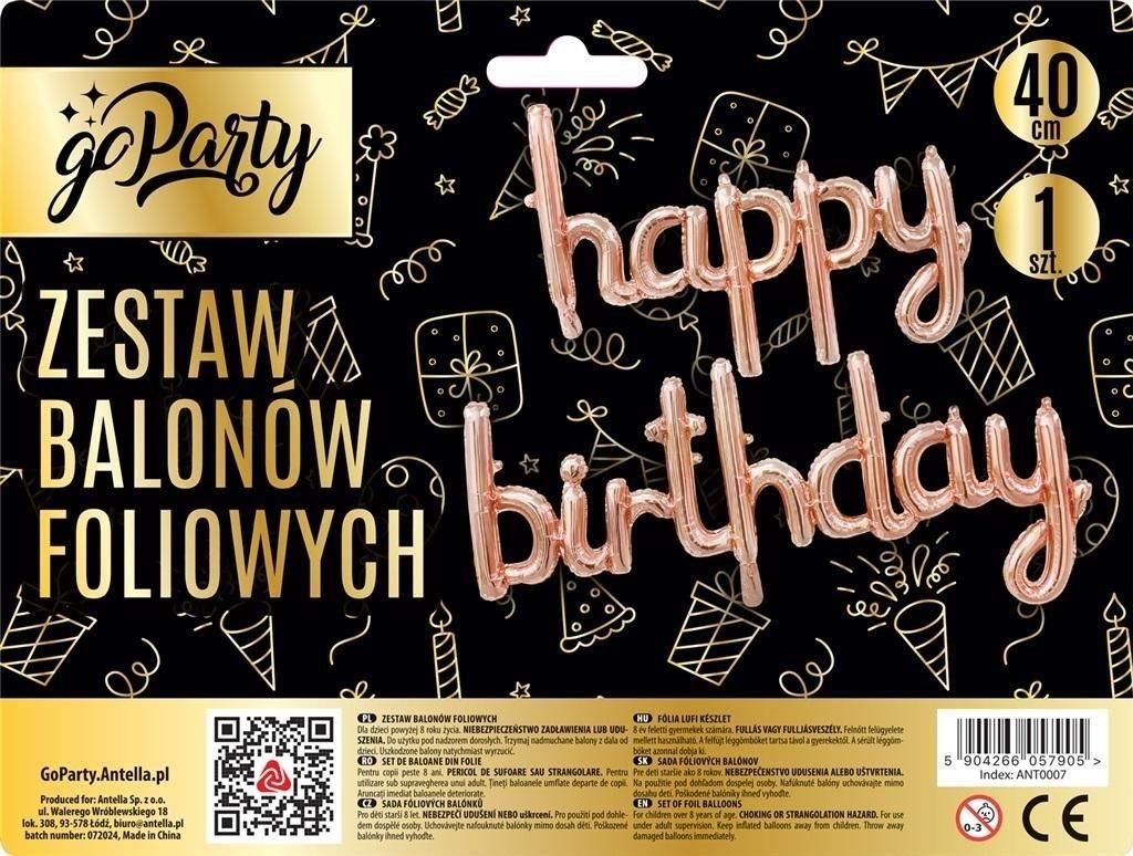 Zestaw balonów foliowych Happy birthday, Rose Gold 13 x balon foliowy literka pisana, o wysokości 40 cm Producent/osoba odpowiedzialna za bezpieczeństwo produktuMK TradeGraniczna 87 lok. 893-428 Łódźbiuro@go-party.pl+48 605 257 325