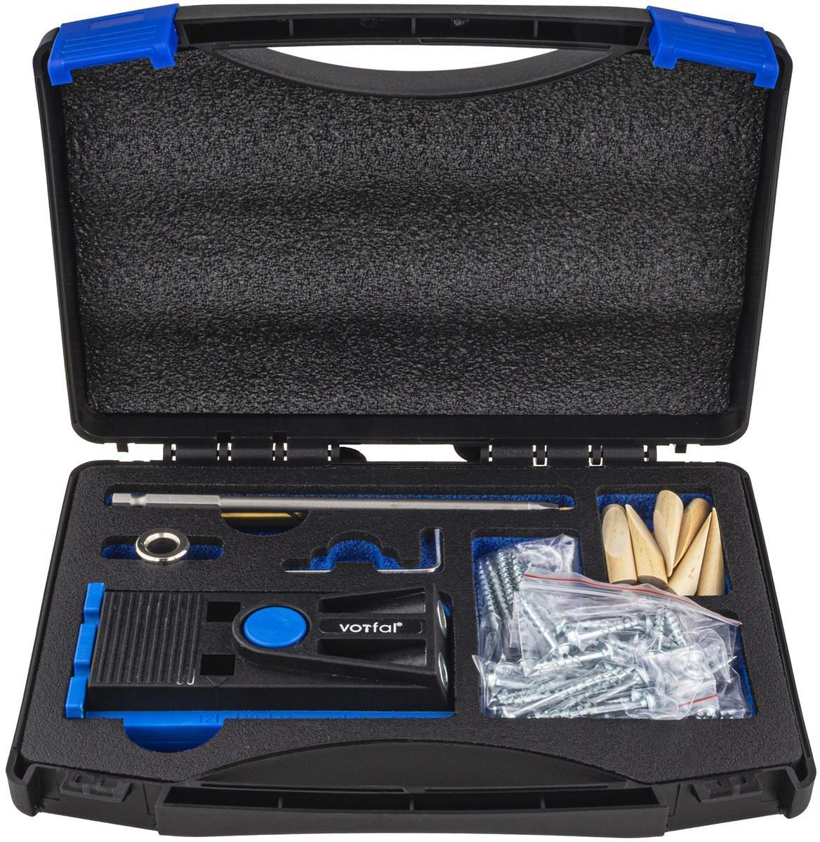 ZESTAW DO POŁĄCZEŃ NIEWIDOCZNYCH UKRYTYCH PRZYRZĄD KOŁKOWNICA SZABLON V07251_2 OPIS PRODUKTU Kompletny zestaw umożliwiający wykonywanie solidnych i estetycznych połączeń niewidocznych przy użyciu wkrętów do drewna. Dzięki niemu w 3 prostych krokach wykonasz precyzyjne i trwałe połączenia ukryte, które sprawdzą się zarówno w profesjonalnym stolarstwie, jak i w domowych projektach DIY. Zestaw zapewnia stabilne i trwałe połączenia, eliminując konieczność stosowania kleju czy widocznych śrub. ZAWARTOŚĆ ZESTAWU Szablon do wykonywania połączeń ukrytych Wiertło stopniowe HSS 9.5 mm, długość 165 mm Ogranicznik głębokości wiercenia Klucz imbusowy 2,5 mm Końcówka do wkrętarki – kwadrat S02, 150 mm 8x drewniany (bukowy) kołek do maskowania otworów 8x wkręt do drewna 4 x 25 mm 8x wkręt do drewna 4 x 32 mm 8x wkręt do drewna 4 x 38 mm 8x wkręt do drewna 4 x 63 mm JAK TO DZIAŁA? Precyzyjne wiercenie – szablon prowadzący pozwala na wykonanie idealnych otworów pod kątem. Łączenie elementów – drewniane części są skręcane za pomocą dołączonych do zestawu wkrętów. Maskowanie otworów – otwory zakrywane są bukowymi kołkami, które można przyciąć i wyszlifować dla idealnego wykończenia. ZALETY PRODUKTU Precyzyjne prowadzenie wierteł dzięki szablonowi Solidne i stabilne połączenia drewna Niewidoczne mocowanie – profesjonalne wykończenie Łatwe i szybkie wykonanie połączeń Uniwersalne zastosowanie – meble, półki, konstrukcje drewniane