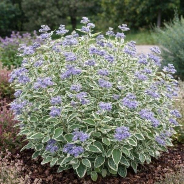 Barbula kladońska White Surprise - pstra (Caryopteris ×cland.) C2 Caryopteris × clandonensis ‘White Surprise’ – wyjątkowa odmiana barbuli klandońskiej o białych kwiatach i dekoracyjnych, jasno obrzeżonych liściach, kwitnąca późnym latem i jesienią, idealna do nowoczesnych i klasycznych ogrodów. …