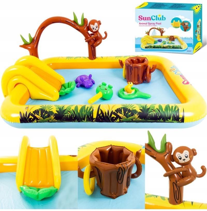 WODNY PLAC ZABAW DLA DZIECI Basen nadmuchiwany DUŻY Zjeżdżalnia + Fontanna Wodny plac zabaw basen ze zjeżdżalnią i fontanną - Zabawa na całego! Oferujemy niezwykły wodny plac zabaw basen ze zjeżdżalnią i fontanną, który zapewni Twoim dzieciom mnóstwo radości i niezapomniane chwile podczas letnich dni! Ten wyjątkowy produkt to więcej niż tylko basen - to mały, nadmuchiwany raj w dżungli, pełen wspaniałych atrakcji i uroczych zwierzątek. Specyfikacja produktu Typ basenu: Basen nadmuchiwany Kształt: Prostokątny Motyw: Dżungla i zwierzątka Wiek: Od 2 roku życia Pojemność: 160L Wymiary zewnętrzne: 214x167x85 cm Waga: 8 kg Materiał wykonania: Winyl Kolor: Odcienie żółtego i brązowego Co znajdziesz w zestawie? 1x Basen 1x Zjeżdżalnia 1x Młotek 1x Małpka 2x Ptaszki 1x Pieniek 1x Siatka 2x Koła 1x Łatka naprawcza Zalety naszego wodnego placu zabaw Wielofunkcyjność: Basen nie jest jedyną atrakcją. Dzieci mogą korzystać z nadmuchiwanej zjeżdżalni, bawić się z uroczymi zwierzątkami (małpka, ptaszki, hipopotam) oraz korzystać z fontanny wodnej, która zapewnia dodatkową frajdę. Bezpieczeństwo: Produkt przeznaczony jest dla dzieci od 2 roku życia, a miękki, winylowy materiał gwarantuje bezpieczną zabawę. Kreatywna zabawa: Dżunglowe motywy i liczne akcesoria, takie jak młotek, pieniek z kołami do rzucania oraz siatka, stymulują wyobraźnię i zachęcają do aktywnej zabawy. Łatwość montażu i przechowywania: Nadmuchiwany basen jest prosty w montażu, a po sezonie można go łatwo złożyć i przechowywać bez zajmowania dużo miejsca. Doskonała jakość: Wykonany z trwałego winylu, basen jest odporny na uszkodzenia i zapewnia długotrwałą zabawę. Nie zwlekaj! Spraw, aby te wakacje były wyjątkowe dla Twojego dziecka. Wodny plac zabaw basen ze zjeżdżalnią i fontanną to idealne rozwiązanie na gorące dni, które przeniesie Twoje pociechy w magiczny świat dżungli. Zapewnij im niezapomniane chwile radości i beztroskiej zabawy w bezpiecznym i kolorowym otoczeniu.