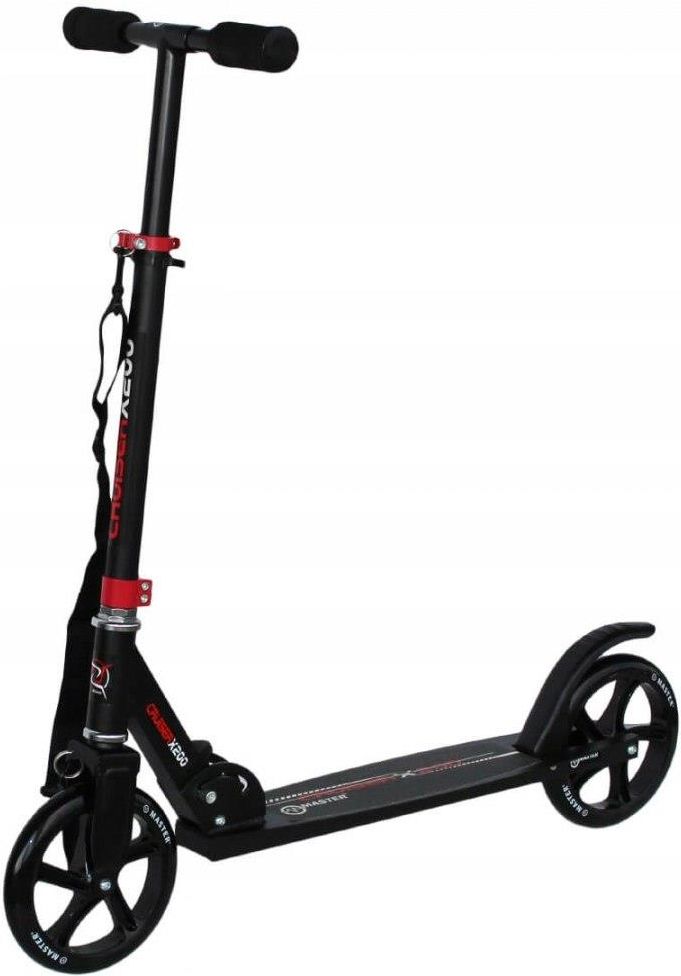 Hulajnoga Składana Cruiser Black 200 mm Hulajnoga Składana Cruiser Black 200 mm (MAS-S052-red) Lekka wzmacniana hulajnoga ze stopką i paskiem transportowym posiada regulowaną wysokość kierownicy. Hulajnoga jest składana, a więc wygodna w transporcie i zajmuje mało miejsca podczas przechowywania. Rączki kierownicy wykonane są z miękkiej pianki zapewniają dobrą chwytność, nie powodują obtarcia i pocenia rąk, co podnosi komfort i bezpieczeństwo jazdy. Tylni błotnik służy jako hamulec. Parametry: Lekka aluminiowa rama Konstrukcja składana Koła: PU 200 mm Łożyska: ABEC 5 Regulowana wysokość kierownicy: 77, 85 i 90 cm Pasek transportowy Szerokość kierownicy: 35 cm Wymiary podestu: 34 x 11 cm Maksymalna waga użytkownika: 100 kg Wymiary całkowite: 90 x 33 x 90 cm Waga: 3,7 kg Waga paczki: 4,5 kg Wymiary paczki: 30 x 82 x 12 cm Firma Master to Czeski producent doskonałej jakości sprzętu sportowego. W swojej ofercie posiadają szeroką gamę asortymentu zarówno do ćwiczeń siłowych, turystyki oraz rekreacji. Szczegółowa instrukcja montażu/obsługi jeżeli jest wymagana zostanie dołączona do wysyłki.Mimo dołożenia wszelkich starań nie gwarantujemy, że publikowane dane techniczne oraz zdjęcia (odcienie, wzorki) nie zawierają braków lub błędów. Ewentualne błędy nie mogą być podstawą do roszczeń.Wszystkie oferowane przez nas towary pochodzą z renomowanych hurtowni sportowych i są produktami oryginalnymi wprowadzonymi na Polski rynek zgodnie z przepisami prawa.