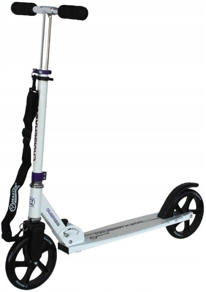 Hulajnoga Składana Cruiser White 200 mm Hulajnoga Składana Cruiser White 200 mm (MAS-S052-white) Lekka wzmacniana hulajnoga ze stopką i paskiem transportowym posiada regulowaną wysokość kierownicy. Hulajnoga jest składana, a więc wygodna w transporcie i zajmuje mało miejsca podczas przechowywania. Rączki kierownicy wykonane są z miękkiej pianki zapewniają dobrą chwytność, nie powodują obtarcia i pocenia rąk, co podnosi komfort i bezpieczeństwo jazdy. Tylni błotnik służy jako hamulec. Parametry: Lekka aluminiowa rama Konstrukcja składana Koła: PU 200 mm Łożyska: ABEC 5 Twardość kół: 82A Regulowana wysokość kierownicy: 77, 85 i 90 cm Pasek transportowy Szerokość kierownicy: 35 cm Wymiary podestu: 34 x 11 cm Maksymalna waga użytkownika: 100 kg Wymiary całkowite: 90 x 33 x 90 cm Waga: 3,7 kg Waga paczki: 4,5 kg Wymiary paczki: 30 x 82 x 12 cm Firma Master to Czeski producent doskonałej jakości sprzętu sportowego. W swojej ofercie posiadają szeroką gamę asortymentu zarówno do ćwiczeń siłowych, turystyki oraz rekreacji. Szczegółowa instrukcja montażu/obsługi jeżeli jest wymagana zostanie dołączona do wysyłki.Mimo dołożenia wszelkich starań nie gwarantujemy, że publikowane dane techniczne oraz zdjęcia (odcienie, wzorki) nie zawierają braków lub błędów. Ewentualne błędy nie mogą być podstawą do roszczeń.Wszystkie oferowane przez nas towary pochodzą z renomowanych hurtowni sportowych i są produktami oryginalnymi wprowadzonymi na Polski rynek zgodnie z przepisami prawa.