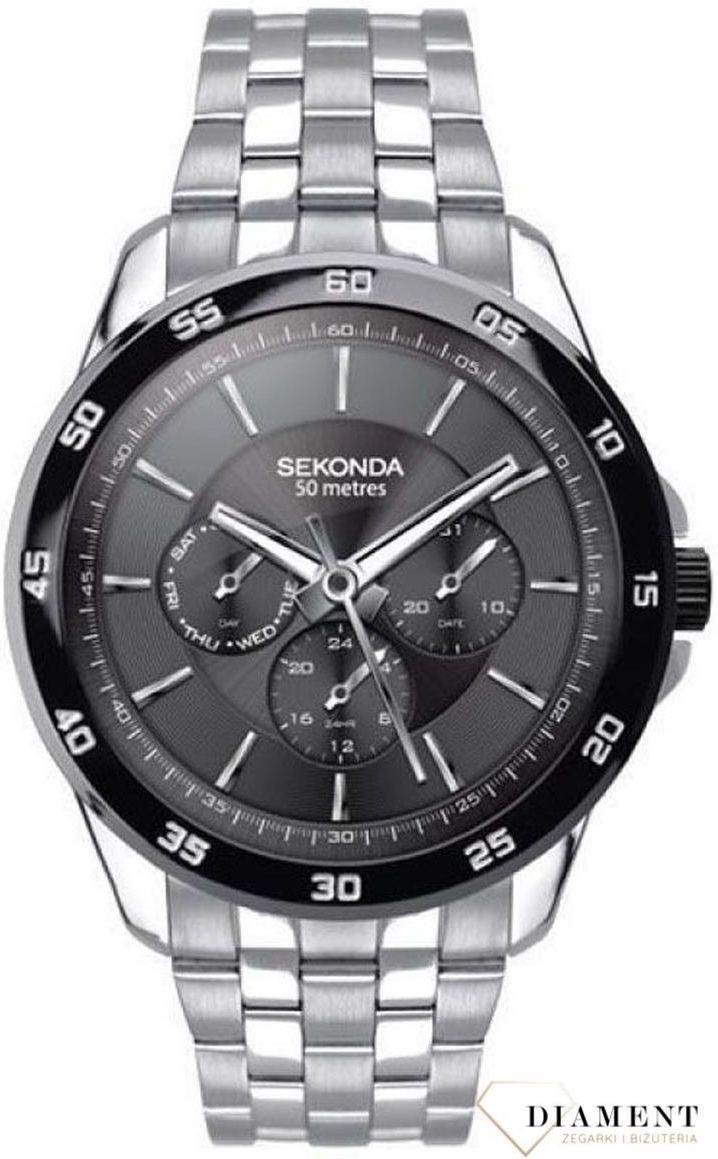 Zegarek męski Sekonda 'Czarna tarcza' 1392. Piękny zegarek męski Sekonda na stalowej bransolecie z elegancką tarczą w kolorze czarnym. Model który zachwyca nietuzinkowym wykonaniem. Ten zegarek męski to elegancki dodatek pasujący do codziennego looku jak i na bardziej wystawne i eleganckie spotkania np. biznesowe. Tarczę zegarka osłania szkło mineralne. Sprawdź pozostałą ofertę! > Męskie Sekondy Stwórz komplet! > Bransoletki męskie MECHANIZM: Zegarek męski Sekonda 1392 wyposażony jest w kwarcowy mechanizm, zasilany za pomocą baterii. Posiada bardzo wysoką dokładność mierzenia czasu +/- 10 sekund w przeciągu 30 dni. KOPERTA: Mechanizm japoński mieści się w okrągłej, wytrzymałej kopercie. Koperta wykonana z ALLOY’u, czyli bardzo popularnego stopu metali na bazie mosiądzu. Charakteryzuje się stosunkowo niewielka wagą, a jednocześnie dużą wytrzymałością. Koperta nie zawiera niklu i innych pierwiastków szkodliwych dla zdrowia. Wykorzystanie wysokiej jakości stali w deklu (dolna część zegarka) gwarantuje, że czasomierz odporny jest na korozję i uszkodzenia oraz nie powoduje alergii. Stop stali szlachetnej charakteryzuje się optymalna odpornością na korozje. W zegarkach Sekonda wykorzystany jest jeden z najlepszych stopów stali 316 L. SZKŁO: Zegarek wyposażony w szkło mineralne ( 5 stopień w skali Mohsa) - najczęściej spotykane, bardzo przejrzyste, czyste, cienkie, elastyczne i odporne na pęknięcia. TARCZA: Tarcza zegarka w czarnym odcieniu z indeksami, oraz wskazówkami w kolorze srebrnym. Ciekawym dodatkiem na tarczy jest duże i czytelne logo. BRANSOLETA: Wykorzystanie wysokiej jakości stali w bransolecie gwarantuje, że zegarek odporny jest na korozję i uszkodzenia oraz nie powoduje alergii. Stop stali szlachetnej charakteryzuje się optymalna odpornością na korozje. W zegarkach wykorzystany jest jeden z najlepszych stopów stali 316 L. ZAPIĘCIE: Standardowe zamknięcie na podwójny zatrzask gwarantuje posiadaczowi tego zegarka, że nie zsunie mu się z ręki nawet w momencie niechcącego otwarcia. Natomiast zamknięcie bransolety odbywa się przez zatrzaśnięcie i domknięcie zabezpieczenia. WODOSZCZELNOŚĆ: Zegarek z wodoszczelnością 50m (5 ATM), gwarantuje właścicielowi, że nie musi bać się zachlapań, czyli np. mycia rąk. Oprócz tego w zegarku można się kąpać, pływać na basenie itp. DATOWNIK: Wygodny datownik umieszczony na tarczy ukazuje w formie popularnego okienka aktualny dzień miesiąca i dzień tygodnia. MULTIDATA: Zegarek z kalendarzem rozmieszczonym na trzech małych tarczach. Wskazane są na nich: dzień tygodnia, dzień miesiąca oraz miesiąc roku. Nasz sklep internetowy z zegarkami Sekonda jest autoryzowanym dystrybutorem marki. Wszystkie damskie i męskie zegarki Sekonda zakupione w naszym sklepie posiadają 2 letnią gwarancję i zapakowane są w oryginalne opakowanie.