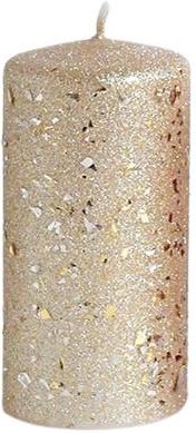Świąteczna świeca Glamour - walec z złoto-srebrnymi drobinkami i złotym brokatem Wprowadź do swojego domu odrobinę świątecznego blasku i elegancji z tą złotą świecą Glamour. Matowa złota powierzchnia, ozdobiona subtelnymi złoto-srebrnymi drobinkami oraz złotym brokatem, tworzy efekt migoczącego …