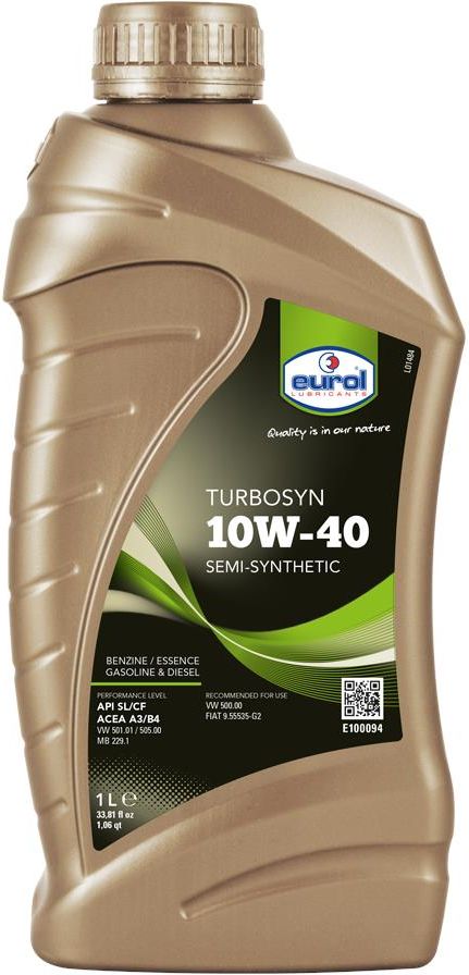 Wysokiej jakości olej silnikowy przeznaczony do uniwersalnego stosowania Eurol Turbosyn 10W-40 to półsyntetyczny olej silnikowy do uniwersalnego stosowania w silnikach benzynowych i wysokoprężnych w samochodach osobowych i lekkich pojazdach dostawczych. Olej ten zapewnia dobry film olejowy przy zimnym rozruchu silnika, również w niskich temperaturach i oferuje doskonałą smarowność w wysokich temperaturach pracy. Eurol Turbosyn 10W-40 ze specjalnym pakietem dodatków uszlachetniających może być eksploatowany w każdych warunkach. Produkt oferuje oszczędność w spalaniu paliwa i redukuje emisję. Z powodu unikalnej formulacji olej ma niską tendencję do parowania. Eurol Turbosyn 10W-40 oferuje doskonałe właściwości przeciwzużyciowe, przeciwpienne i chroni silnik przed powstawaniem rdzy i korozji. Zastosowane dodatki zapobiegają powstawaniu osadów i szlamów utrzymując silnik w czystości i dobrym stanie technicznym. Specyfikacja: API SL/CF ACEA A3/B4 VW 501.01 MB 229.1 VW 505.00 VW 500.00 Fiat 9.55535-G2