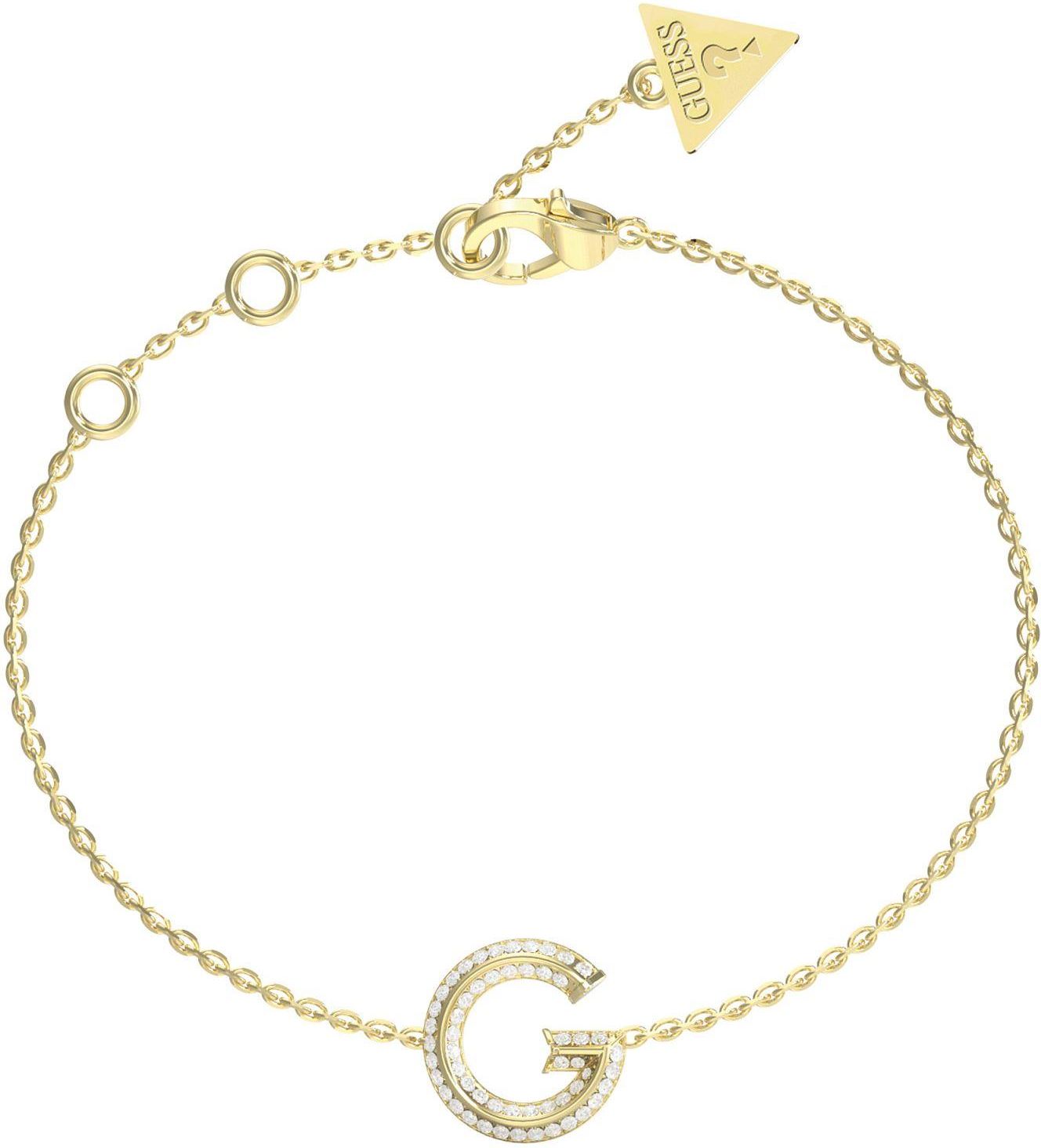 Damska błyszcząca platerowana pozłacana stalowa bransoletka Guess z kolekcji G Crystal. Złocenie w kolorze żółtego złota. Zdobiona cyrkoniami zawieszka w kształcie litery G. Regulowana długość.
