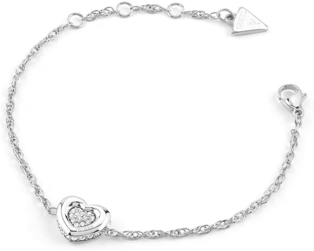Biżuteria - Parametry: Materiał - STAL NIERDZEWNA, KRYSZTAŁKI Kolor - SREBRNY Zapięcie - KARABIŃCZYK Wykończenie - KRYSZTAŁKI Biżuteria - Wymiary: Długość bransoletki - 14,5-18,5cm Przy zakupie otrzymujesz: Oryginalną biżuterię GUESS, Pudełko i torebkę GUESS, Woreczek na biżuterię GUESS, Certyfikat autentyczności.