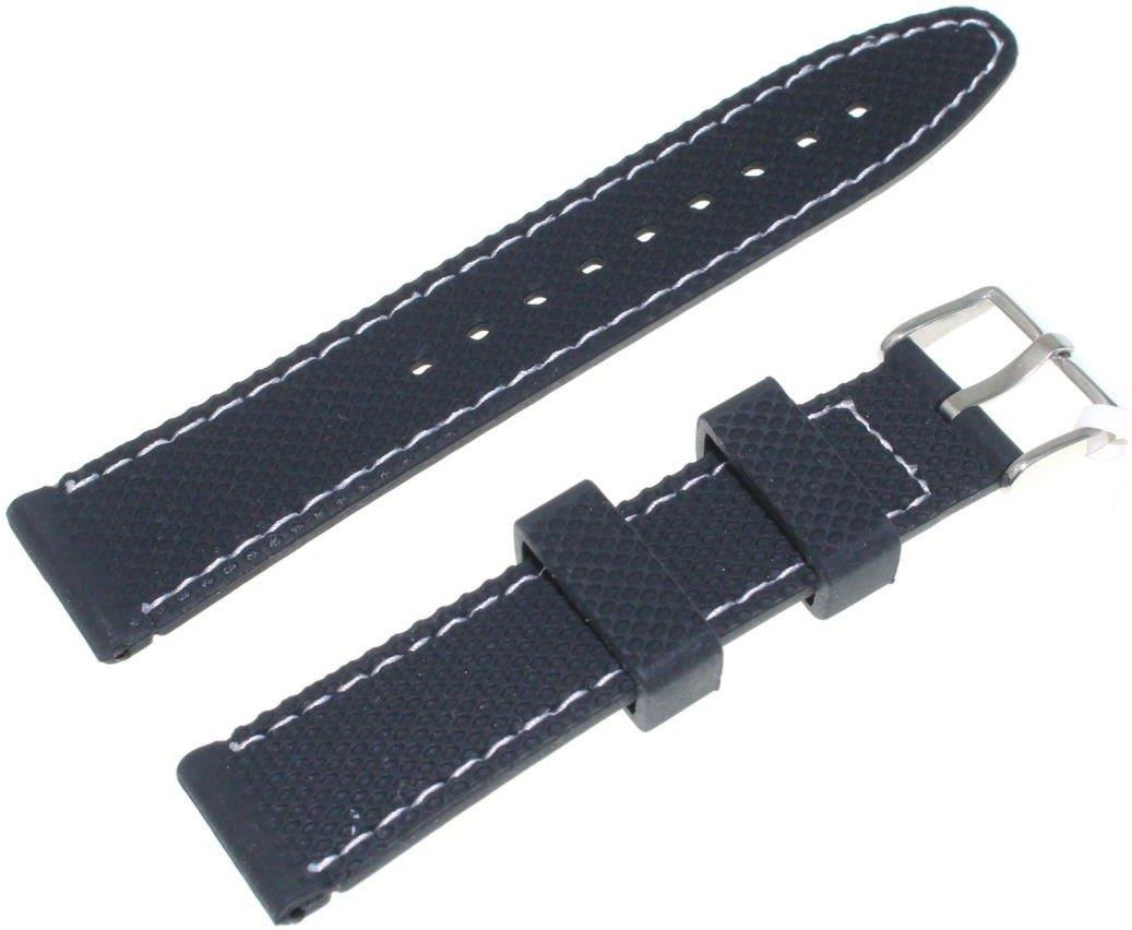 Czarny silikonowy zwężany przeszywany matowy wodoodporny pasek do zegarka 20 mm firmy JVD. Szerokość 20 mm. Pasuje do wszystkich zegarków ze standardowym mocowaniem o szerokości 20 mm. Komplet teleskopów gratis
