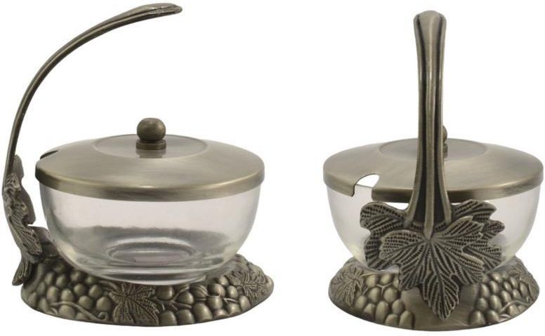 Przepiękna cukiernica ze szklanym wkładem i łyżeczką. Komplet składający się z cukiernicy ze szklanym wkładem oraz łyżeczki. Klasyczna cukiernica jest wykonana z metalu w kolorze cyny, a jej powierzchnia zabezpieczona specjalną powłoką co wpływa na jej trwałość i odporność. Szeroka i solidna owalna podstawa zapewnia stabilność, ozdobiona jest tłoczeniami z motywem winogron, dzięki czemu prezentuje się bardzo elegancko. Uchwyt do przenoszenia cukiernicy połączony jest z jej podstawą. Zawartość pojemnika jest chroniona metalową, gładką pokrywką. Do cukiernicy dołączona jest elegancka łyżeczka do cukru. Wewnątrz posiada szklany, wyjmowany wkład na cukier, dzięki czemu pozwala na wygodne mycie. Cukiernica wyróżnia się elegancją i oryginalnym kształtem, znakomicie prezentując się w każdym wnętrzu. Artykuły z tej linii z pewnością będą doskonałym pomysłem na prezent. Wyroby te z pewnością zachwycą każdego miłośnika antyków. Klasyczna cukiernica to naczynie niezastąpione w naszej kuchni i jadalni. Pozwala na eleganckie podanie cukru. Sprawdzi się zarówno na co dzień, jak i podczas rodzinnych przyjęć. Pokryte są specjalną warstwą ochronną zabezpieczającą przed śniedzeniem. Aby zachowały swój nienaganny wygląd należy czyścić je specjalnie do tego przeznaczonymi preparatami oraz polerować. W zestawie znajduje się obudowa + szklany pojemnik + pokrywka + łyżeczka Wymiary cukiernicy wysokość całkowita: 11 cm średnica wkładu: 8,5 cm długość łyżeczki: 12,5 cm Możliwość mycia w zmywarce: Nie. Zalecane mycie ręczne i polerowanie do sucha. Opakowanie: Estetyczne utwardzone pudełko. Na życzenie klienta pakujemy ozdobnie na prezent.( usługa-9zł) Wówczas prosimy napisać o tym w uwagach. Prosimy jednak pamiętać, że wówczas prezentu nie można zobaczyć przed wręczeniem.