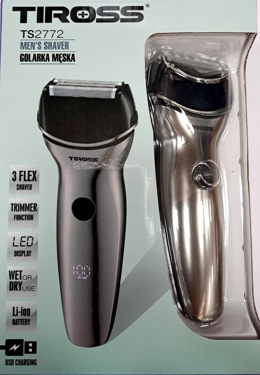 Golarka do brody bezprzewodowa marki TIROSS TS-2772 Dziatanie: przewodowe/bezprzewodowe 2 folie i 1 ręczny nóż Wewnętrzne ostrza do golenia Bateria litowo-jonowa 600mAh Czas ładowania:1,5H Czas pracy:60 minut Z wysuwanym trymerem Cyfrowy wyświetlacz,blokada podróżna Poziom mocy w procentach % Przypomnienie o czyszczeniu, ,TAP"- symbol zaświeci się, aby pamiętać wyczyścić golarkę po 30 działaniach Kabel USB 80cm Akcesoria szczoteczka do czyszczenia,kapturek ochronny, etui SPECYFIKACJA TECHNICZNA Działanie przewodowe/bezprzewodowe 2 folie i 1 środkowy nóż Wewnętrzne ostrza do golenia Wysuwany trymer Wskaźnik LED Wodoodporność IPX6 Bateria li-ion 600mAh Przewód USB 80 cm Szczoteczka do czyszczenia, kapturek ochronny, etui Czas pracy: 60 min. Czas ładowania: 1,5 godz. Poziom mocy w % Cyfrowy wyświetlacz Przypomnienie o czyszczeniu Ostrzeżenie o spadku zasilenia Blokada podróżna Pakowanie: 12 szt/ktn Kod EAN: 5901698508944