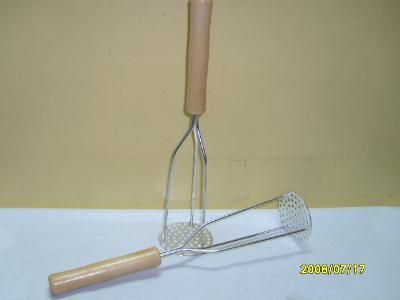 Tłuczek do ziemniaków wykonany jest z metalu a jego rączka z drewna. Jest duży, ale poręczny. Szybko i sprawnie utłuczesz nim ugotowane ziemniaki lub dla odmiany przyrządzisz pyszne ziemniaczane puree. W powierzchni tłukącej ma bowiem gęsto rozmieszczone otwory do ubijania. Łatwy w czyszczeniu, nie odbarwia się. Doskonale sprawdzi się w każdej kuchni. Materiał, z którego jest wykonany to ocynkowany metal, który zapewni trwałość produktu. Rączka ubijaka jest drewniana. Parametry: długość: 28 cm szerokość: 7 cm wysokość: 7 cm materiał: metal, drewno