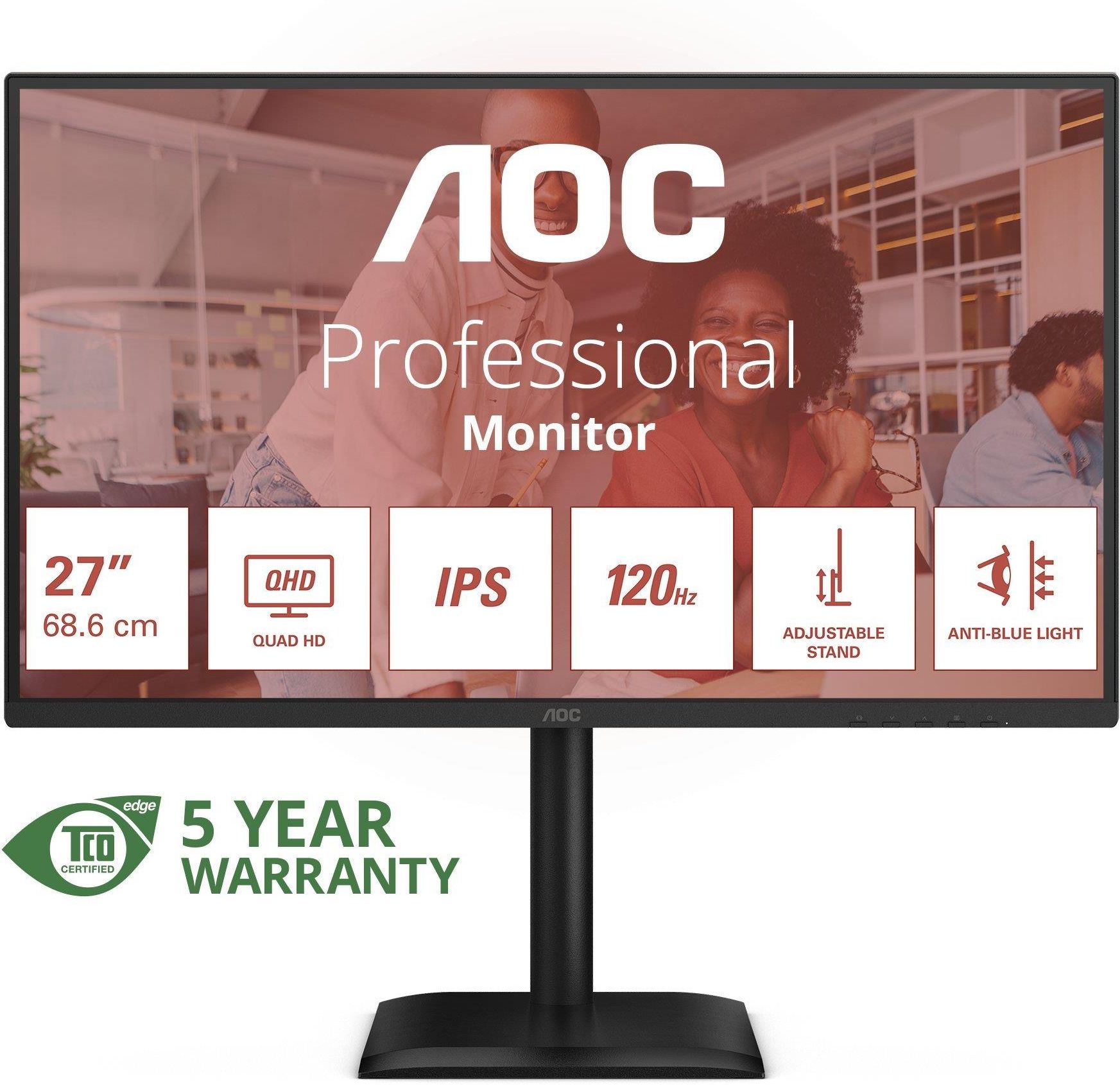 AOC E4 Q27E4U, 68,6 cm (27"), 2560 x 1440 px, Quad HD, LED, 4 ms, Czarny Otwieraj nowe horyzonty dzięki monitorowi Q27E4U o przekątnej 27 cali, z rozdzielczością QHD, częstotliwością odświeżania 120 Hz, możliwością ustawiania wysokości oraz 5-letnią gwarancją Otwieraj nowe horyzonty dzięki …
