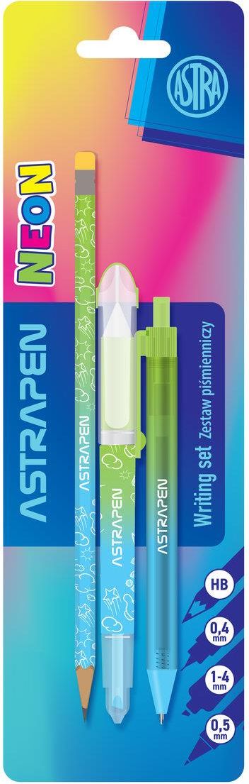 Zestaw Piśmienniczy ASTRAPEN NEON - 4 Elementy Przedstawiamy zestaw piśmienniczy ASTRAPEN NEON składający się z czterech innowacyjnych przyborów, które ułatwią codzienne notowanie. Dwustronny Zakreślacz i Cienkopis 2w1 Niezwykle praktyczne narzędzie, które po jednej stronie jest zakreślaczem, a po drugiej cienkopisem. Świetnie nadaje się do tworzenia oraz ozdabiania notatek. Zakreślacz posiada ściętą końcówkę dla precyzyjnego podkreślania. Nietoksyczny tusz, który nie przebija na kolejne strony. Cienkopis pisze linią o grubości 0,4 mm, co czyni go doskonałym wyborem do pracy z linijkami i szablonami. Automatyczny Długopis Olejowy 0,5 mm Wyposażony w olejowy wkład o grubości 0,5 mm, co gwarantuje płynność pisania. Zapewnia wyjątkową lekkość podczas użytkowania. Tusz o pięknym niebieskim kolorze. Ołówek Grafitowy HB Wykonany z miękkiego, a jednocześnie odpornego na złamania grafitu. Trójkątny kształt zapewnia odpowiednie ułożenie dłoni. Wyposażony w gumkę do ścierania, co czyni go praktycznym. Produkty dostępne w różnych wzorach, a konkretna wersja wysyłana jest losowo. Cena dotyczy pojedynczego zestawu. EAN: 5901137213200