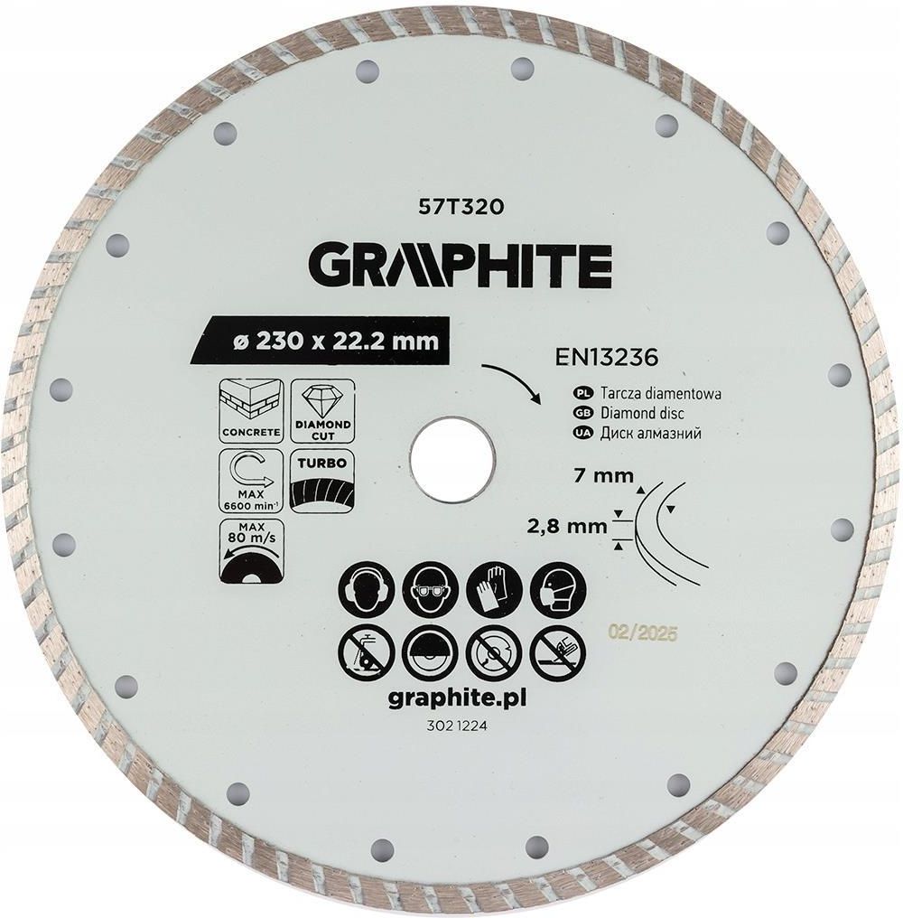 Tarcza diamentowa do cięcia turbo, 230 x 22.22 mm, na sucho, GRAPHITE 57T320 Tarcza diamentowa do cięcia turbo, 230 x 22,2 mm, na sucho 57T320 marki GRAPHITE to niezawodne narzędzie zaprojektowane do efektywnego i precyzyjnego cięcia na sucho. Dzięki swoim parametrom oraz solidnej konstrukcji, idealnie sprawdzi się w różnorodnych pracach budowlanych i remontowych, gwarantując wysoką wydajność i trwałość. Kluczowe cechy i zastosowanie Ta tarcza diamentowa o średnicy 230 mm i standardowym otworze montażowym 22,2 mm jest uniwersalnym rozwiązaniem do wielu elektronarzędzi. W zestawie znajdziesz również praktyczny pierścień redukcyjny, który zwiększa jej kompatybilność. Materiały, do których jest przeznaczona Kamień Cegła Marmur Granit Beton Dzięki zastosowaniu wysokiej jakości diamentów oraz odpowiednio dobranym parametrom, tarcza GRAPHITE doskonale radzi sobie z cięciem twardych i ściernych materiałów, zapewniając czyste i równe krawędzie. Specyfikacja techniczna Typ tarczy: Diamentowa, turbo Rodzaj cięcia: Na sucho Średnica zewnętrzna: 230 mm Średnica otworu montażowego: 22,2 mm Wysokość segmentu tnącego: 7 mm Szerokość segmentu tnącego: 2,8 mm Maksymalna prędkość obrotowa: 6 600 obr./min (odpowiada 80 m/s) Zgodność z normami: EN 13236 Wyposażenie dodatkowe: Pierścień redukcyjny w zestawie Bezpieczeństwo i wydajność Tarcza GRAPHITE spełnia rygorystyczne wymagania normy EN 13236, co potwierdza jej wysoką jakość wykonania i bezpieczeństwo użytkowania. Maksymalna prędkość obrotowa wynosząca 6 600 obr./min (80 m/s) gwarantuje efektywną pracę i szybkie postępy, nawet przy intensywnym użytkowaniu.