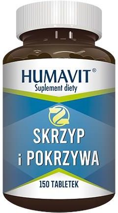 HUMAVIT ® SKRZYP I POKRZYWA (Z)  Z DROŻDŻAMI PIWNYMI 150 TABLETEK Forma produktu: tabletki Ilość porcji: 37 Ilość sztuk: 150 HUMAVIT  Skrzyp i Pokrzywa z drożdżami piwnymi to suplement diety w tabletkach zawierający skrzyp, pokrzywę oraz drożdże piwne. Produkt został stworzony z myślą o osobach dbających o piękny i zdrowy wygląd skóry, włosów i paznokci.  Dlaczego warto kupić skrzyp i pokrzywę z drożdżami firmy HUMAVIT? 250 tabletek w jednym opakowaniu  1 porcja to 4 tabletki Opakowanie wystarcza na ponad miesiąc stosowania  1040 mg drożdży piwnych, 48mg  ekstraktu z skrzypu polnego oraz 32mg  ekstraktu z liścia pokrzywy Działa kompleksowo na włosy, skórę i paznokcie  Drożdże piwne Zdrowotne właściwości drożdży były znane już w starożytności. Dzięki wielu badaniom naukowym wiem, że drożdże mają bardzo korzystny wpływ na zdrowie, a także stan  naszych włosów, skóry i paznokci. Drożdże piwne zawierają szereg witamin z grupy B między innymi biotynę (B7), kwas pantotenowy (wchodzący w skład kompleksu tworzącego witaminę B5), kwas foliowy (B9), witaminę B3 (PP) oraz witaminy B1, B2, B6. Dodatkowo drożdże dostarczają cennych minerałów takich jak: cynk, fosfor, magnez, żelazo, selen, chrom.  Drożdże dzięki swoim właściwościom zapobiegają przetłuszczaniu się skóry, przedwczesnemu siwieniu i wypadaniu włosów. Dodatkowo dzięki zawartości chromu wspomagają utrzymanie prawidłowej masy ciała, który w połączeniu z krążącą w żyłach insuliną odpowiada za przenikanie glukozy do komórek w naszym organizmie. W efekcie następuje zmniejszenie apetytu. Skrzyp polny  Skrzyp polny to zioło, które Francuska klasyfikacja ziół najwyższej mocy stawia na pierwszy miejscu pośród dwudziestu roślin obdarzonych nadzwyczajnymi właściwościami. Skrzyp zawiera bardzo dużo łatwo przyswajalnej krzemionki, która korzystnie  wpływa na młody i piękny wygląd skóry, włosów i paznokci. Roślina zawiera także żelazo, magnez, sole potasu, fosforu, wapnia oraz kobalt. Dodatkowo jest źródłem witaminy C. Skrzyp polny jest źródłem piękna. Wzmacnia włosy, powoduje zmniejszenie ich wypadania oraz przedłuża żywotność. Paznokcie stają mnie mniej łamliwe, a skóra zdrowa i promienna. Zawarty w skrzypie kwas pantotenowy opóźnia procesy starzenia się skóry, dodatkowo cynk działa przeciwzapalnie i przyśpiesza proces gojenia się ran.  Pokrzywa  Pokrzywa to znana wykorzystywana od stuleci roślina. Jest bogatym źródłem wielu witamin i minerałów takich jak: witamina A, B,C,E i K, magnezu, fosforu, wapnia, siarki, żelaza, potasu, jodu, krzemu, sodu, związków aminokwasowych i garbnikowych, olejków eterycznych, soli mineralnych, chlorofilu, serotoniny, histaminy, acetylocholiny, karetonoidów, fitosteroli oraz flawonoidów.  Pokrzywa nazywana jest naturalnym antybiotykiem, ponieważ posiada właściwości antybakteryjne. Duża zawartość krzemionki idealnie wpływa na stan i kondycje włosów, hamuje ich wypadanie oraz powstawanie łupieżu. Pokrzywa dodatkowo wspomaga przemianę materii oraz usuwa toksyny z organizmu dzięki działaniu moczopędnym. Dlaczego warto stosować HUMAVIT Skrzyp i Pokrzywa?   Idealne połączenie trzech produktów, które działają synergicznie dbając o piękne włosy skórę i paznokcie  Drożdże wspomagają odchudzanie dzięki ograniczeniu apetytu, dodatkowo skrzyp polny i pokrzywa przyśpieszają metabolizm0 Pokrzywa usuwa toksyny z organizmu i pomaga w walce z cellulitem, dodatkowo wzmacnia odporność  Drożdże piwne wraz z pokrzywą dodatkowo obniżają poziom cholesterolu