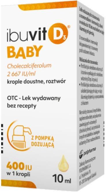 Ibuvit D3 Baby krople doustne 10 ml Lek Ibuvit D3 Baby zawiera jako substancję czynną witaminę D3 (cholekalcyferol), która odgrywa ważną rolę w procesie tworzenia kości oraz we wspieraniu odporności. Cholekalcyferol, jest identyczny z witaminą D wytwarzaną w organizmie człowieka. Co to jest lek Ibuvit D3 Baby i w jakim celu się go stosuje? Lek Ibuvit D3 Baby zawiera jako substancję czynną witaminę D3 (cholekalcyferol), która odgrywa  ważną rolę w procesie tworzenia kości oraz we wspieraniu odporności. Cholekalcyferol, jest identyczny z witaminą D wytwarzaną w organizmie człowieka. Witamina D znajduje się w niektórych produktach spożywczych, jest również wytwarzana  w organizmie, gdy skóra jest eksponowana na promieniowanie słoneczne. Witamina D zwiększa wchłanianie wapnia z jelit i zmniejsza jego wydalanie przez nerki, co  wspomaga budowę kości. Niedobór witaminy D jest przyczyną krzywicy (zaburzonej mineralizacji  kości u dzieci) i osłabienia odporności organizmu. Lek Ibuvit D3 Baby jest stosowany: w profilaktyce niedoboru witaminy D i stanów wynikających z niedoboru witaminy D (np. krzywica); w profilaktyce niedoboru witaminy D u kobiet planujących ciążę, w ciąży i karmiących piersią,  w porozumieniu z lekarzem. Profilaktyczne przyjmowanie witaminy D zalecane jest w okresie niedostatecznej ekspozycji na  światło słoneczne, w miesiącach od października do kwietnia lub przez cały rok, jeśli nie jest  zapewniona efektywna synteza skórna witaminy D w miesiącach letnich. Jak stosować lek Ibuvit D3 Baby? Ten lek należy zawsze stosować dokładnie tak, jak to opisano w ulotce dla pacjenta lub według zaleceń  lekarza lub farmaceuty. W razie wątpliwości należy zwrócić się do lekarza lub farmaceuty. Uwaga: 1 dawka (1 kropla) zawiera 400 IU witaminy D3. Skrót IU (ang. International Unit) oznacza  jednostki międzynarodowe, którymi oznacza się aktywność witaminy D. Profilaktyka niedoboru witaminy D i stanów wynikających z niedoboru witaminy D U pacjentów z prawidłową masą ciała, w miesiącach od października do kwietnia lub przez cały rok,  jeśli nie jest zapewniona efektywna synteza skórna witaminy D w miesiącach letnich. Wcześniaki: U dzieci urodzonych przed terminem lek Ibuvit D3 Baby należy stosować wyłącznie pod nadzorem lekarza i w sposób zalecony przez lekarza. Zwykle stosowana dawka to 400-800 IU (1-2 krople) w zależności od stanu zdrowia dziecka, jego masy oraz tygodnia ciąży, w którym doszło do przedwczesnego porodu. Dawkowanie musi być ustalone przez lekarza prowadzącego. Noworodki i niemowlęta (do ukończenia 1. roku życia) 400 IU (1 kropla) U noworodków i niemowląt lek powinien być stosowany zgodnie z zaleceniami lekarza. Dzieci w wieku od 1 do 3 lat 400 IU (1 kropla) Dzieci w wieku od 4 do 10 lat 800 IU (2 krople) Dzieci z nadwagą Dzieci z nadwagą (wskaźnik masy ciała [ang. body mass index, BMI] > 90-tego centyla  odpowiedniego dla wieku i płci) wymagają podwojonej dawki witaminy D względem dawki  rekomendowanej rówieśnikom o prawidłowej masie ciała. Profilaktyka niedoboru witaminy D u kobiet planujących ciążę, w ciąży i karmiących piersią Zazwyczaj zalecana dawka dobowa to 2000 IU (5 kropli), niezależnie od pory roku, chyba że lekarz  zaleci inny sposób dawkowania. W czasie ciąży kobiety powinny stosować się do zaleceń lekarza prowadzącego, ponieważ ich  zapotrzebowanie na witaminę D może różnić się w zależności od zasobów ustrojowych witaminy D. Nie należy stosować leku Ibuvit D3 Baby dłużej niż zalecane lub w większych dawkach, jak również  nie stosować jednocześnie innych leków, suplementów diety ani innego rodzaju środków  spożywczych zawierających witaminę D (cholekalcyferol), kalcytriol lub inne metabolity i analogi  witaminy D bez porozumienia z lekarzem. Lekarz może zalecić pomiar stężenia 25(OH)D w  surowicy. Sposób podawania Podanie doustne. Lek Ibuvit D3 Baby najlepiej przyjmować podczas posiłku. Leku Ibuvit D3 Baby nie należy mieszać z mlekiem w butelce ani z pokarmami miękkimi  w pojemnikach, gdyż jeśli dziecko nie spożyje całej porcji, nie otrzyma ono pełnej dawki leku. Należy  zapewnić przyjęcie całej dawki leku. Roztworu nie wolno wlewać ani pompować do ust bezpośrednio z butelki czy pompki dozownika.  Należy za pomocą pompki odmierzyć dawkę leku na łyżeczkę. Jak przechowywać lek Ibuvit D3 Baby? Lek należy przechowywać w miejscu niewidocznym i niedostępnym dla dzieci. Nie przechowywać w temperaturze powyżej 25°C. Przechowywać w opakowaniu zewnętrznym w celu  ochrony przed światłem. Nie stosować tego leku po upływie terminu ważności zamieszczonego na pudełku i butelce. Termin  ważności oznacza ostatni dzień podanego miesiąca. Rozpoczęte opakowanie należy zużyć w ciągu 3 miesięcy. Leków nie należy wyrzucać do kanalizacji ani domowych pojemników na odpadki. Należy zapytać  farmaceutę, jak usunąć leki, których się już nie używa. Takie postępowanie pomoże chronić  środowisko. Zawartość opakowania i inne informacje Co zawiera lek Ibuvit D3 Baby: Substancją czynną leku jest cholekalcyferol. Każda kropla, która stanowi 1 dawkę zawiera 400 IU cholekalcyferolu (witaminy D3). Pozostały składnik to: triglicerydy kwasów tłuszczowych o średniej długości łańcucha. Jak wygląda lek Ibuvit D3 Baby i co zawiera opakowanie Lek Ibuvit D3 Baby ma postać przezroczystego, bezbarwnego do jasnożółtego roztworu. Butelka z oranżowego szkła typu III, z zakrętką z PE z pierścieniem gwarancyjnym, z pompką  dozującą z PP/LDPE w tekturowym pudełku. Opakowanie zawiera 10 ml roztworu. Podmiot odpowiedzialny Podmiot odpowiedzialny Zakłady Farmaceutyczne POLPHARMA S.A. ul. Pelplińska 19, 83-200 Starogard Gdański tel. +48 22 364 61 01 Wytwórca Zakłady Farmaceutyczne POLPHARMA S.A. Oddział Medana w Sieradzu ul. W