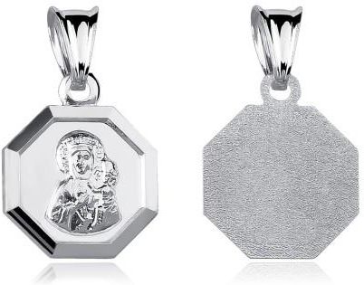 Zawieszka o ciekawym okrągłym kształcie wykonana z wysokiej jakości srebra próby 925. Model stanowi srebrny dwustronny medalik z centralnie umiejscowionym wizerunkiem Matki Boskiej Częstochowskiej. Zawieszka cechuje się wyjątkową delikatnością oraz precyzją wykonania nawet w najmniejszym szczególe. Idealny zarówno do noszenia na co dzień, jak i jako prezent dla wyjątkowej osoby. Długość zawieszki: 21 mm Szerokość zawieszki: 12 mm Kolor: Srebrny Materiał: Srebro próby 925 Waga: 1,4g