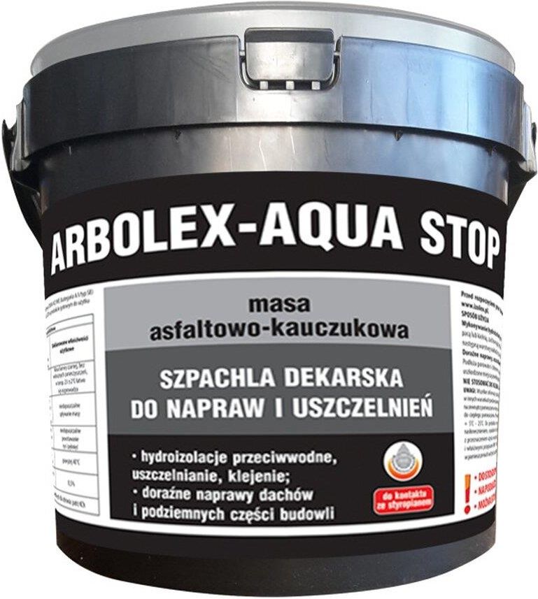 IZOLEX ARBOLEX AQUA STOP 1KG Szpachla dekarska do napraw i uszczelnień. Można stosować na podłoża mokre i pod wodą, również poniżej 0°C. Zalety produktu: - bezpieczny w kontakcie z płytami EPS i XPS - nie wymaga gruntowania; możliwość stosowania na podłoża zmrożone w ujemnych temperaturach do -20°C - możliwość aplikacji na podłoża suche, wilgotne oraz mokre - odporny na agresywne substancje zawarte w gruncie Zastosowanie: naprawa uszkodzeń i ubytków oraz wypełnień w pokryciach dachowych (załamań, pęknięć, szpar, pęcherzy, przecieków itp.), wykonywanie miejscowych uszczelnień hydroizolacji, uszczelnianie przejść technologicznych.