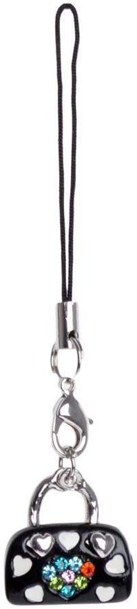 Breloczek kuferek czarny Stan: Nowy Metalowa zawieszka - torebka z serduszkami, z kolorowymi kryształkami. Wymiary bez zapięcia: 1,5x,2x0,5cm.