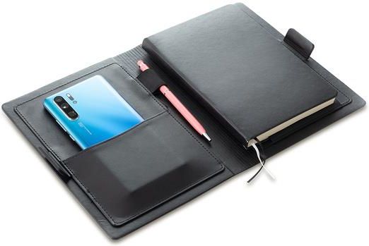 Elegancki organizer z notesem w linie (80 kartek), posiada kieszeń na telefon, uchwyt na długopis oraz kieszonkę na wizytówki. Zamykany na magnetyczne zapięcie. Możliwość wymiany notesu. Rozmiar 12,5 x 18,4 cm. Telefon i długopis nie jest dołączony.