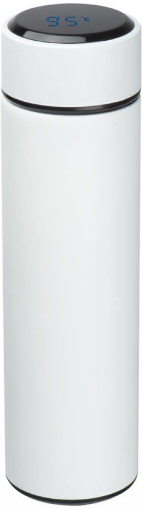 Termos ze stali nierdzewnej z elektronicznym termometrem w plastikowej pokrywce. Wystarczy go dotknąć, a temperatura napoju pokazuje się na wyświetlaczu. Termos utrzymuje ciepłą temperaturę napoju do 6 godzin, a zimną - do 9. Pojemność 450 ml.