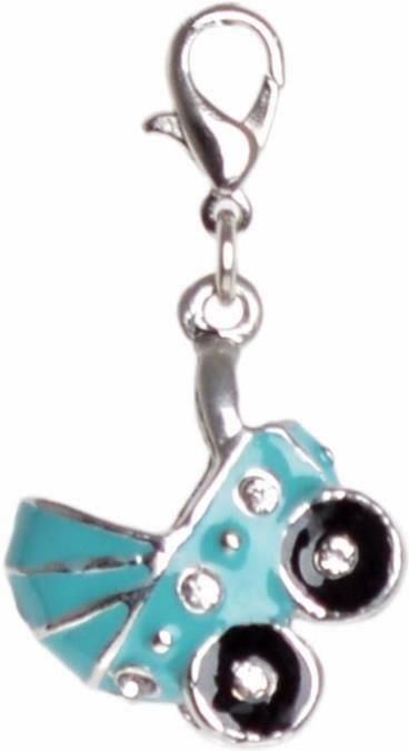 Metalowa zawieszka - niebieski wózeczek. Wymiary bez zapięcia: 2x2x1cm.