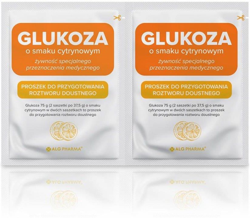 Glukoza o smaku cytrynowym 2 saszeteki x 37,5 g Przeznaczenie Do postępowania dietetycznego w stanach niedoboru węglowodanów, stanach wyczerpania, np. po długotrwałym wysiłku fizycznym, w stanach hipoglikemii u pacjentów z rozpoznaną cukrzycą. Produkt przeznaczony jest do stosowania u osób powyżej 12 roku życia. Przechowywanie Przechowywać w oryginalnym opakowaniu w temperaturze do 25 °C, w miejscu suchym oraz w sposób niedostępny dla małych dzieci. Po otwarciu saszetki przygotować roztwór w przeciągu 24 godzin. Sposób przygotowania wsypać zawartość saszetki do szklanki, uzupełnić wodą (do 200-300 ml), zamieszać do rozpuszczenia; spożyć bezpośrednio po przygotowaniu. Sposób użycia w stanach wyczerpania, po wysiłku: wypić małymi porcjami roztwór przygotowany z jednej saszetki. w przypadkach wystąpienia objawów obniżenia się poziomu cukru – hipoglikemii zaleca się spożycie pół szklanki przygotowanego roztworu i kontrolę glikemii po 15 minutach. W przypadku utrzymującej się hipoglikemii zaleca się spożycie kolejnej połowy szklanki przygotowanego roztworu i kontrolę glikemii po 15 minutach. Uwaga: połowa jednej saszetki odpowiada: 18,75 g glukozy. Nie należy przekraczać zalecanej dziennej porcji do spożycia. Ważne informacje Produkt przeznaczony jest do stosowania u osób powyżej 12 roku życia. Produkt musi być stosowany pod nadzorem lekarza. Produkt jest niekompletnym środkiem spożywczym i nie jest odpowiedni do stosowania jako jedyne źródło pożywienia. Produkt nie może być stosowany przez osoby, u których nie stwierdzono wymienionych we wskazaniach stanów chorobowych czy zaburzeń stanu zdrowia. Ostrzeżenia Produkt nie jest przeznaczony do stosowania pozajelitowego. Masa netto 2 x 37,5g Producent ALG Pharma Sp. z o. o. ul. Marcina Kasprzaka 31 01-234 Warszawa