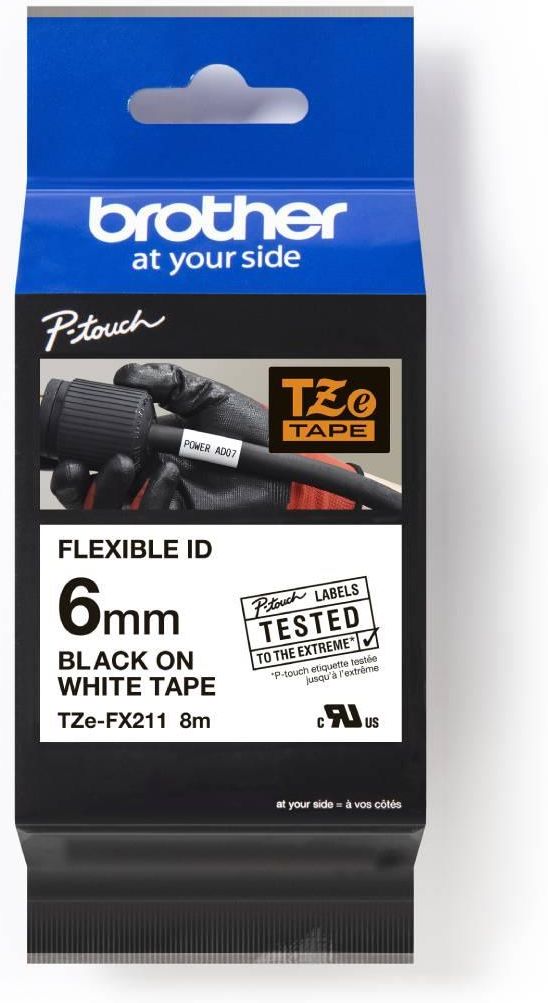 Brother TZe-FX211 6mm szerokości, 8m długości Wysokiej jakości oryginalna taśma firmy Brother Zapewnia wyraźne i trwałe rezultaty Opis produktu  Brother TZe-FX211 Taśma identyfikacyjna Flexi ID - TZe-FX211 firmy Brother. Nośnik zaprojektowany w celu identyfikacji kabli, przewodów, rur PCV lub innych produktów o cylindrycznym kształcie. Specjalny mocny klej taśmy TZe-FX211 zapewnia jej trwałość. Etykiety z czarnym nadrukiem na białym tle. Taśma kompatybilna z drukarkami P-touch, które posiadają logo TZ lub TZe na pokrywie taśmy. Kompatybilne z Brother P-touch 200, P-touch 310, P-touch 350, P-touch 1200, P-touch 1800, P-touch 2400, P-touch 1200P, P-touch 2500PC, P-touch 9200PC, PT1000F, PT1000TCM, P-touch 1005F, P-touch 1230PC, P-touch 1250, P-touch 1250 J, P-touch 1250, P-touch 1250S, P-touch 1250, P-touch 1280CB, P-touch 1280DT, P-touch 1280, P-touch 1750, P-touch 1800E, P-touch 1850CC, P-touch 1850, P-touch 1850VP, P-touch 1950VP, P-touch 210E, P-touch 220, P-touch 2400E, P-touch 2420PC, P-touch 2430PC Black Edition, P-touch 2430PC, P-touch 2450CC, P-touch 2450DX, P-touch 2450, P-touch 2480, P-touch 300, P-touch 550, P-touch 9200DX, P-touch 9400, P-touch 9500PC, P-touch 9700PC, P-touch 9800P. Więcej informacji o produkcie  Brother TZe-FX211 Taśma identyfikacyjna Flexi ID - TZe-FX211, została zaprojektowana do znakowania kabli i światłowodów. Szerokość nośnika to 6 mm, charakteryzuje się czarnym nadrukiem na białym tle. Taśma TZe-FX211 została poddana rygorystycznym testom, aby zapewnić szybkie i wydajne drukowanie etykiet identyfikacyjnych. Taśma zawiera specjalny klej, który umożliwia aplikację etykiet na kable, rury PCV lub inne produkty o cylindrycznym kształcie. TZe-FX211 nadaje się również do stosowania na innych ściśle zakrzywionych powierzchniach, takich jak rury i przewody. Twoja etykieta może być wielokrotnie owinięta wokół kabla lub przyklejona do niej jako flaga. Taśma identyfikacyjna TZe-FX211 jest kompatybilna z drukarkami etykiet. Laminowany nośnik jest odporny na ekstremalne temperatury, światło słoneczne, wodę, chemikalia i ścieranie.