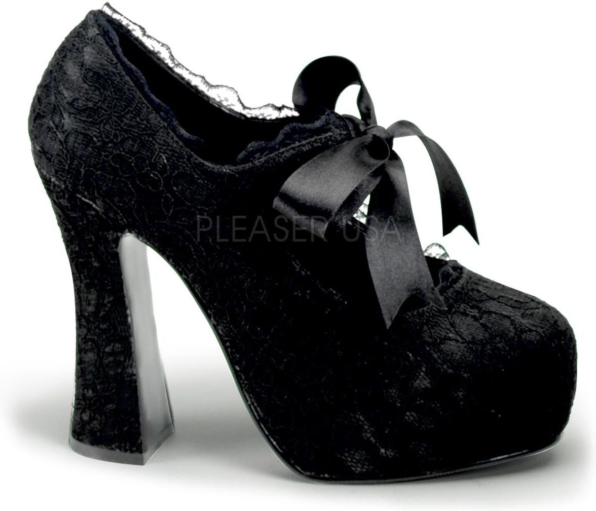 Z przyjemnością prezentujemy w ofercie naszego sklepu Demon-11 – czyli obłędnie zmysłowe, koronkowe pantofle gotyckie z kokardą od renomowanego producenta gotyckiego obuwia, marki Demonia. Buty Demonia model Demon-11 utrzymane zostały w gotyckim stylu, choć z wiktoriańskim zacięciem, odrobinę Mary Jane. Wyczuć w nich można retro aurę. To zdecydowanie idealna propozycja dla współczesnych dam, które czują, że powinny się narodzić wieki temu. Wszystko w tym modelu zostało pomyślane idealnie. Satynowe platformy marki Demonia zapewniają Ci lekkość i stabilność kroku łącząc 3.8 centymetrową platformę z 12.7 centymetrowym obcasem. Bez obcasa ich wysokość jest na poziomie 38 centymetrów. Zdecydowanie wysmuklają sylwetkę. Pokochasz je jednak przede wszystkim za wygląd. Czółenka ze wstążką Demonia Demon-11 obciągnięte satyną wysokiego gatunku i wykończone urokliwą koronką prezentują się zjawiskowo. Dodadzą klasy do każdej stylizacji. Po prostu będziesz je nosić z wysoko podniesioną głową, dumą i pełnym przekonaniem!