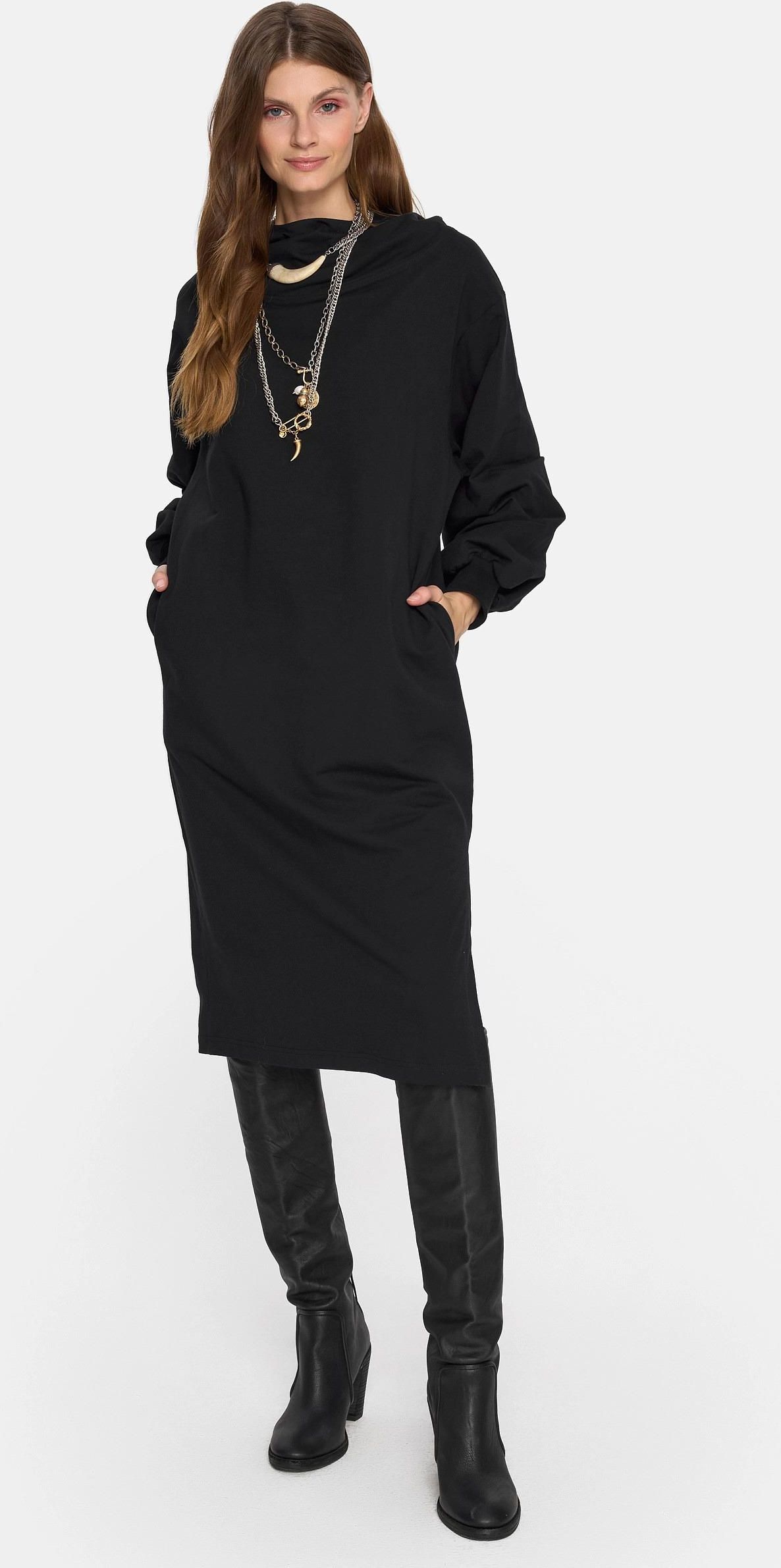 KOLOR: CZARNY Bawełna 94%, elastan 6% Dzianina dresowa. GRAMATURA: 250 G/M2 Sukienka o luźnym kroju z długim rękawem i szerokim kołnierzykiem typu komin. Uszyta z miękkiej, elastycznej dzianiny, zapewnia komfort i swobodę ruchów. Zaprojektowana i uszyta w Polsce. • luźny fason, • długi rękaw, • kołnierz typu komin, • rozcięcie po boku, • kieszenie boczne, • modelka ma 177 cm wzrostu i nosi rozmiar M. Wymiary