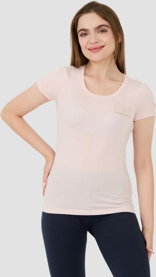 Różowy damski t-shirt, marki EA7 Emporio Armani.Wymiary modelki: wzrost 172 cm, biust 82 cm, talia 62 cm, biodra 90 cm.Modelka ma na sobie produkt w rozmiarze XS.Wymiary produktu w rozmiarze XS: szerokość pod pachami: 39 cm, długość całkowita: 56 cm.