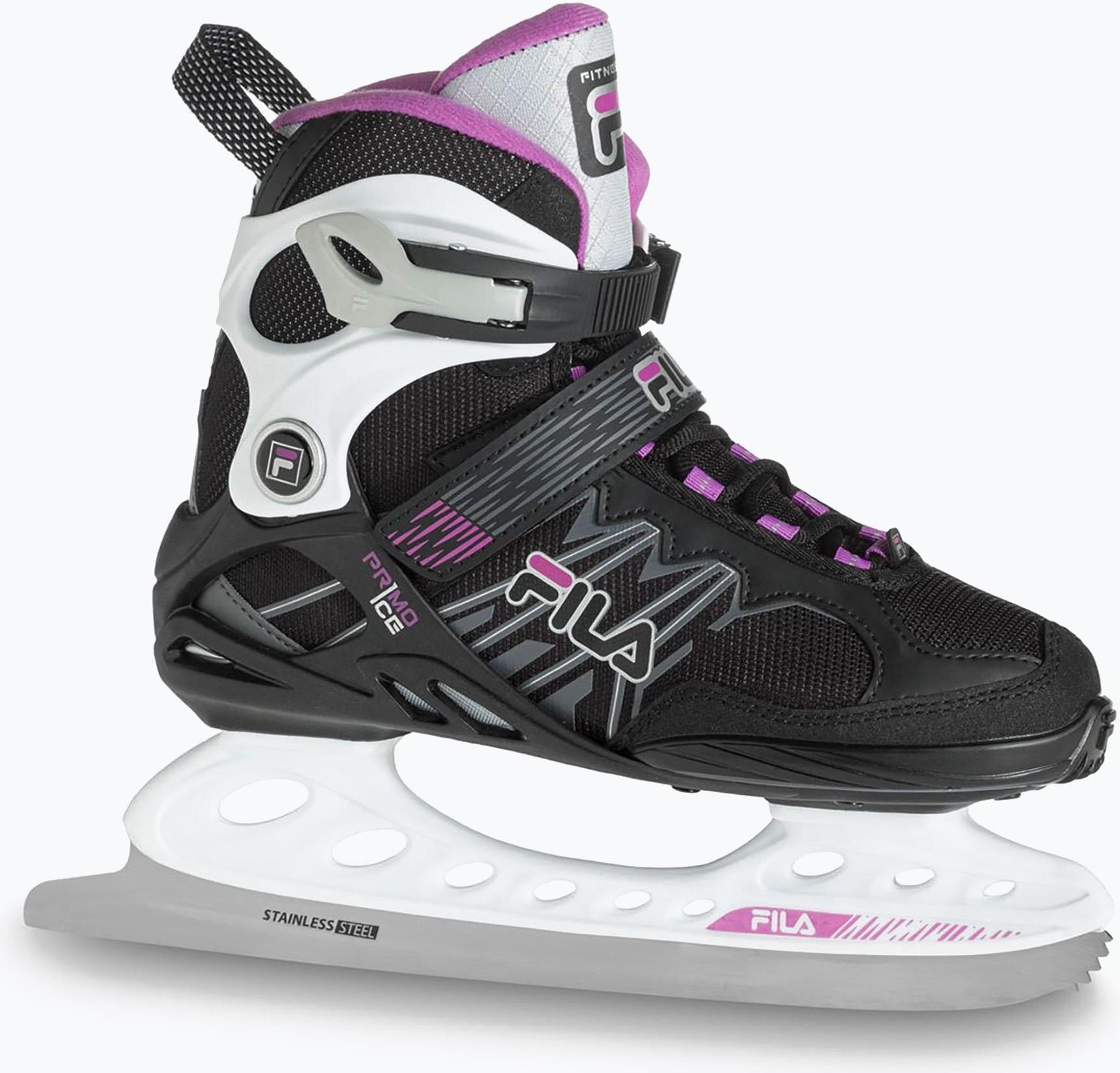 Płoza wykonana z ostrza ze stali nierdzewnej Praktyczny system zapinania Konstrukcja buta gwarantująca wsparcie Podwyższona cholewka Boczne wsparcie i lepsza kontrola zgięcia Anatomiczna wyściółka Damskie łyżwy FILA Primo Lady, przeznaczone do jazdy rekreacyjnej, wyposażone w specjalnie zaprojektowaną podwyższoną cholewkę, która doskonale stabilizuje kostkę i oferuje maksymalne wsparcie dla nogi, ułatwiając jazdę oraz anatomiczną wyściółkę w celu idealnego dopasowania i stabilności. Ich anatomiczna wyściółka podążą za ergonomią stopy, a tym samym zwiększa komfort w trakcie dłuższego użytkowania. Wyposażone w klasyczny system sznurowania, pasek mocujący oraz regulowany system zapinania ze sprzączką to gwarancja stabilności podczas jazdy na lodzie. Płoza wykonana została ze stali nierdzewnej polerowanej piaskowanej o 3 mm grubości, co pozwala cieszyć się jazdą bez konieczności częstego ostrzenia.