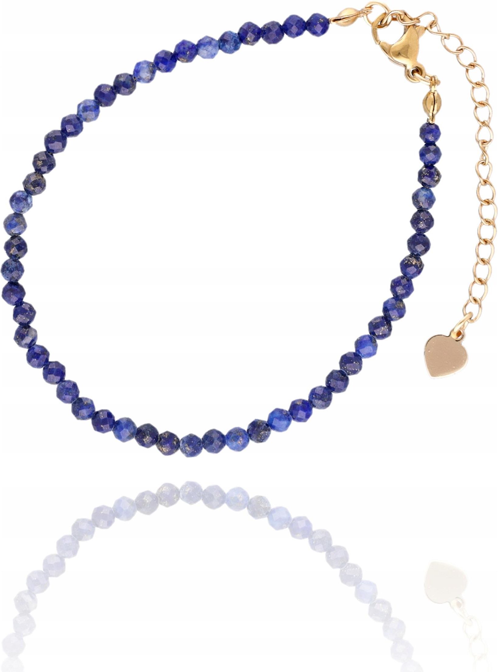 Bransoletka z Lapis Lazuli Delikatna Bransoletka z Kamieniami Naturalnymi Bransoletka z Kamieniem Lapis Lazuli Specyfikacja Kamień: lapis lazuli Długość: około 17 cm + 5 cm regulacji Koralik: 3-4 mm Kolor: złoty, niebieski, granatowy, szary Zapięcie: klasyczne, z regulacją Materiał: kamień, stal szlachetna pozłacana Każda bransoletka jest unikatowa. Zdjęcia przedstawiają przykładowe bransoletki. Bransoletka wysyłana losowo. Opakowanie: ozdobna tekturka biżuteryjna. Niebieska Bransoletka z Kamieniami Cechy Kamienie naturalne: fasetowane kamienie naturalne. Kolorystyka: odcienie niebieskiego, przeplatane srebrzystymi inkluzjami. Zapięcie: klasyczne zapięcie typu karabińczyk w kolorze złotym. Regulacja długości: łańcuszek przedłużający z zawieszką w kształcie serca. Styl: delikatny, minimalistyczny, kobiecy. Zalety Uniwersalna: pasuje do różnych stylizacji – zarówno codziennych, jak i eleganckich. Właściwości kamienia: lapis lazuli jest ceniony za swoje właściwości energetyczne i piękny kolor. Regulowana długość: możliwość dopasowania do różnych rozmiarów nadgarstka. Zawieszka serce: dodaje uroku i subtelnego, romantycznego akcentu. Fasetowane kamienie: efektownie odbijają światło, co nadaje trójwymiarowości i blasku. Bransoletka z Kamieniem Naturalnym Lapis Lazuli Zachęca do samoświadomości, umożliwia wyrażanie siebie i odkrywa wewnętrzną prawdę, nadając osobowości cechy uczciwości i moralności. Stymuluje obiektywizm oraz przejrzystość w pojmowaniu świata. Pomaga w konfrontacji i mówieniu prawdy oraz budzi pewność siebie. Spaja relacje, pomaga w wyrażaniu uczuć i emocji poprzez dbanie o szczerość w związkach. Łagodzi złość i negatywne myśli.