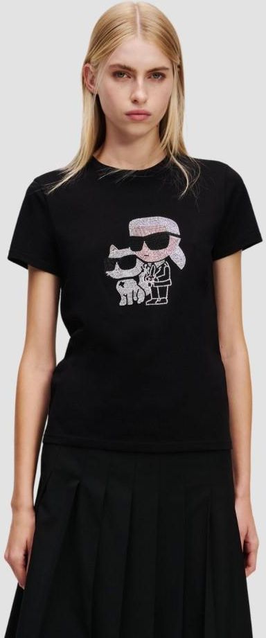 Сzarny damski t-shirt z cyrkoniami Ikon Duo, marki Karl Lagerfeld.Na zdjęciu produkt w rozmiarze: S.Wymiary produktu w rozmiarze S: szerokość pod pachami: 45 cm, długość całkowita: 60,5 cm.