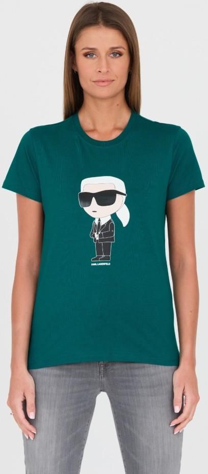 Zielony t-shirt damski marki Karl Lagerfeld. Wymiary modelki: wzrost 176 cm, biust 85 cm, talia 65 cm, biodra 92 cm. Modelka ma na sobie produkt w rozmiarze S.