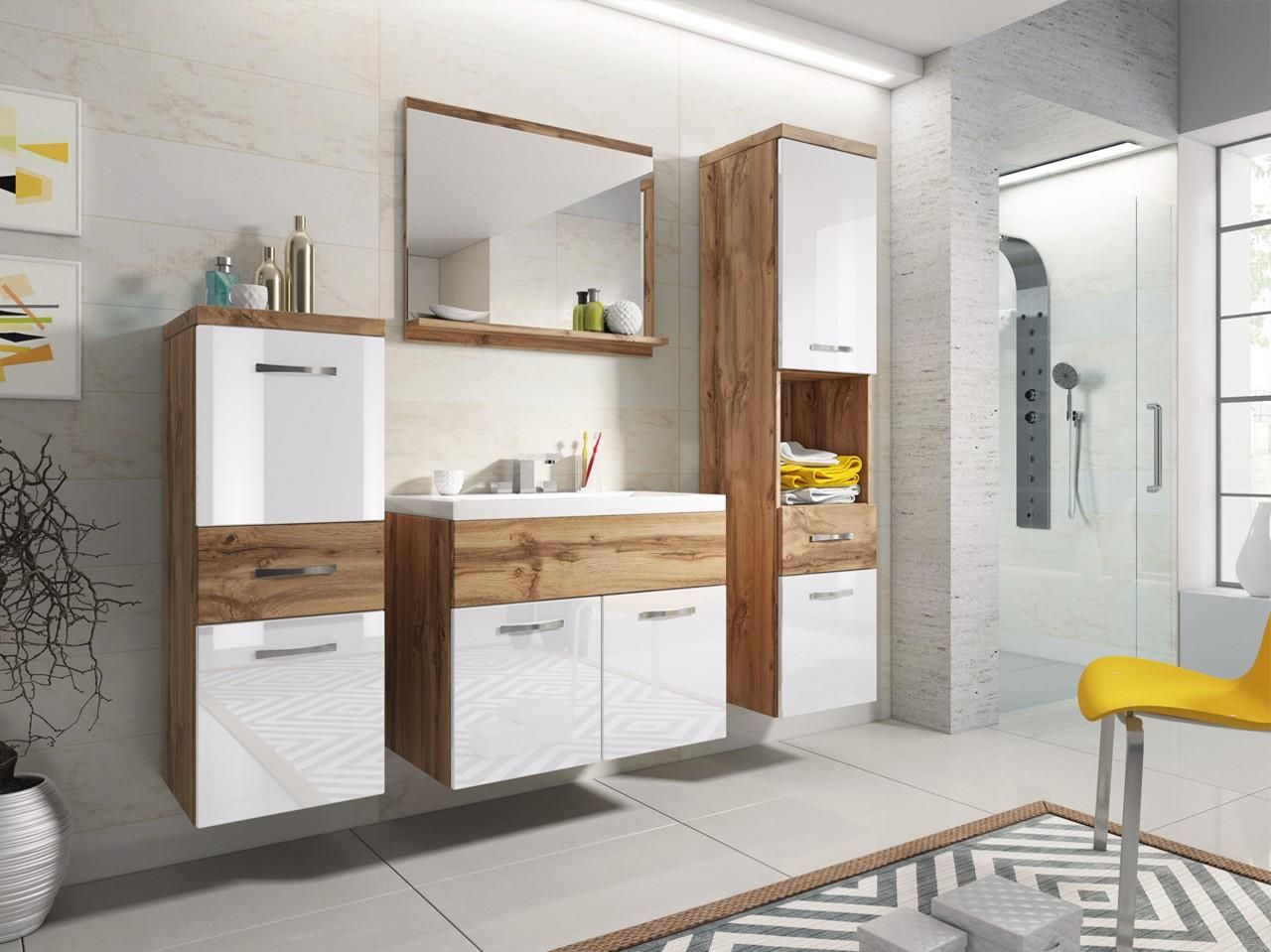 Zestaw mebli łazienkowych Alba wotan/biały lamel.W skład kompletu wchodzi pojemna szafka pod umywalkę z zamykaną szafką, a także ceramiczna umywalka o klasycznym kształcie, która doskonale komponuje się z prostą linią mebli. Zestaw uzupełnia wysoka szafka z półkami i szufladami, zapewniająca dużą przestrzeń do przechowywania ręczników, kosmetyków i akcesoriów oraz praktyczna szafka średnia z dodatkowymi szufladami, idealna na drobniejsze przedmioty. Całość dopełnia lustro z dyskretną półką, które nadaje wnętrzu lekkości i stanowi wygodne miejsce na kosmetyki codziennego użytku.Model Alba to propozycja dla osób, które cenią nowoczesny styl, funkcjonalność i elegancję.Bryła mebla wykonana jest w kolorze wotan i biały lamel, cowprowadza do wnętrza harmonię, a jednocześnie zachowują nowoczesny charakter, idealnie pasujący do współczesnych aranżacji.Meble wykonane są z płyty MDF, co gwarantuje ich trwałość i łatwość w utrzymaniu czystości.Proste uchwyty nadają całości nowoczesny wygląd i podkreślają minimalistyczny design kolekcji. Wymiary:Model objęty jest 2 letnią gwarancją producenta.Produkt dostarczymy do Państwa BEZPŁATNIE pod wskazany adres na terenie całego kraju.Mebel wymaga samodzielnego montażu, zgodnie z załączoną instrukcją.Co WAŻNE: zgodnie z prawem i naszymregulaminemmają Państwo pełne prawo do zwrotu nieużywanych towarów, jeśli nie spełnią one Państwa oczekiwań.