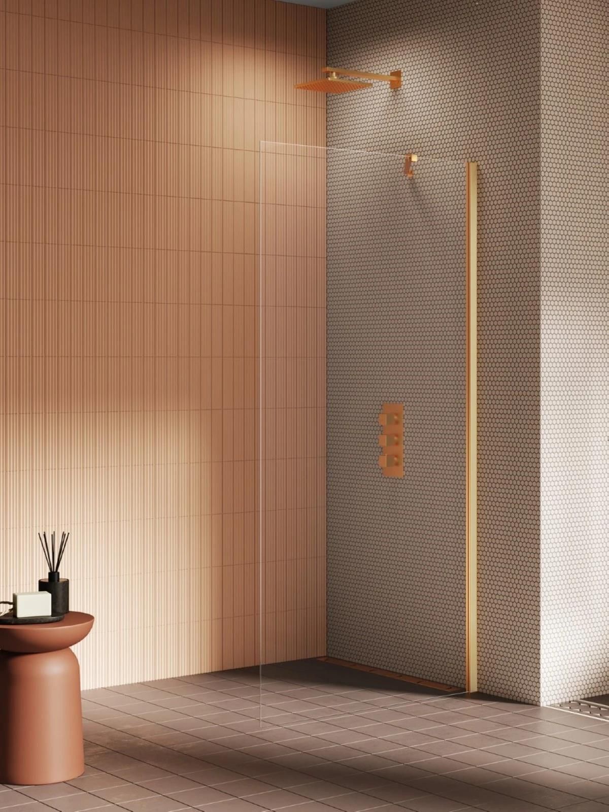Walk-in NEW SOLEO GOLD BRUSHED K-4316 – Szczotkowanie, szkło 6 mm Wybór projektanta Model NEW SOLEO GOLD BRUSHED (80x195) jako walk-in oferuje elegancki wygląd i nowoczesne linie, które podkreślają charakter łazienki. Kolor: Złoty. Wykończenie: Szczotkowanie. Grubość szkła: 6 mm. Trwałość na lata Dzięki zastosowanej powłoce Active Shield 2.0, szkło zyskuje odporność na zabrudzenia i jest łatwe w pielęgnacji. Swoboda aranżacji Ten wariant o wymiarze 80x195 pasuje do wielu aranżacji łazienkowych. Model New Soleo Gold Brushed cechuje się eleganckimi złotymi akcentami o szczotkowanej powierzchni. Kabiny prysznicowe z ukośnym wspornikiem posiadają 6 mm bezpieczne, hartowane szkło z powłoką Active Shield 2.0. Można je montować z brodzikiem lub bez. Kolekcja ma 3-letnią gwarancję, a produkt dostępny jest również jako na zamówienie. Zamontuj raz – korzystaj przez lata bez kompromisów.