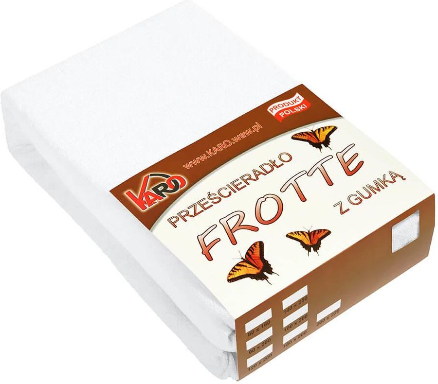 Prześcieradło frotte z gumką 120x200 białe 001 grube 200g/m2 KARO KARO Prześcieradło frotte z gumką 120x200 białe 001 grube 200g/m2 KARO Prześcieradło frotte z gumką jest miękkie i przyjemne w dotyku, a spanie na nim to czysta przyjemność. Szeroka gama kolorystyczna pozwoli na dopasowanie koloru prześcieradła do każdej pościeli. Z kolei wysoka jakość zastosowanych materiałów sprawi, że długo będziesz cieszyć się wyborem prześcieradła KARO. Prześcieradło zachowuje swój fason i utrzymuje intensywny kolor nawet po wielu praniach. Do prześcieradła polecamy również pościele dostępne na innych naszych podstronach. Rozmiar: 120x200 cm. Tolerancja rozmiaru +/-3%. Zakład prześcieradła wynosido 20 cm i nie jest wliczany do rozmiaru. Prześcieradłoprzeznaczone jest na materace o wysokości do 20 cm. Dzięki bokom z narożnymi zaszewkami, profilującymi prześcieradło do kształtu materaca oraz gumce poprowadzonej w tuneliku produkt doskonale dopasowuje się i układa na materacach o różnej grubości. Skład tkaniny: 82% bawełna, 18% poliester. Materiał: frotte - lekko rozciągliwy i niewymagający prasowania, dzięki czemu jest wyjątkowo wygodny w użytkowaniu. Gramatura: 200 g/m2 - najgrubsze prześcieradło na polskim rynku. Prześcieradła frotte z gumką KARO występują w 14 rozmiarach tj. 60x120, 70x140, 70x160, 80x160, 80x200, 90x200, 120x200, 140x200, 160x200, 160x220, 180x200, 200x200, 200x220, 220x240 w ponad 40 kolorach. Przepis konserwacji: prać w temperaturze do 40°C, nie wybielać, nie prasować, nie czyścić chemicznie, suszyć w stanie rozwieszonym. Indeks katalogowy: 207194 Kod kreskowy EAN: 5904941800093 Marka: KARO