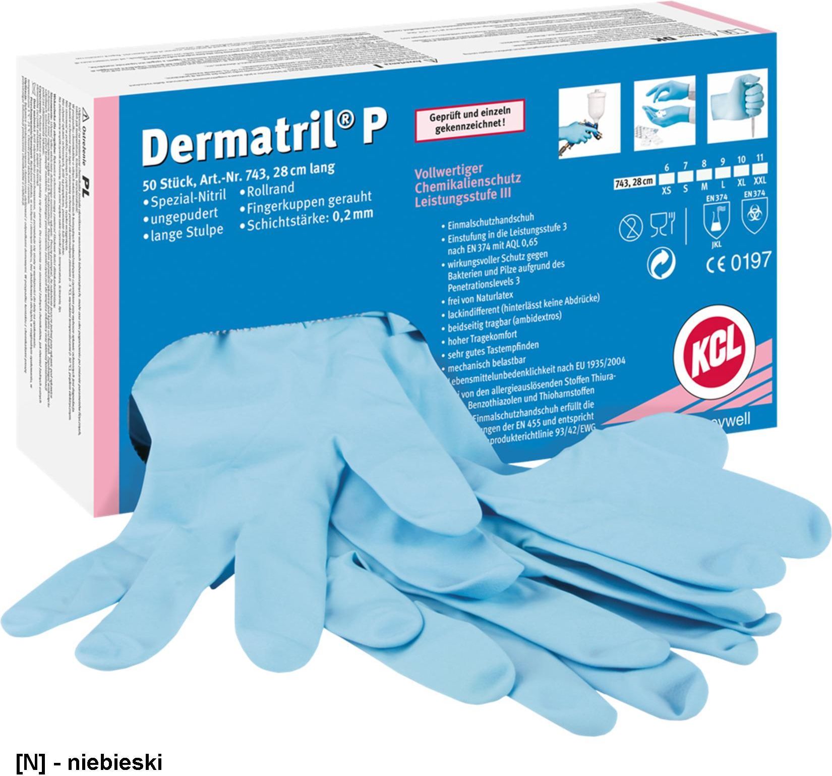 KCL-DERMA743 Jednorazowe rękawice nitrylowe dermatrill 743. ochronne przeznaczone do użycia w: laboratoriach, instytutach badawczych, przemyśle chemicznym, spożywczym, elektronicznym i komputerowym, czyszczeniu i konserwacji oraz ochronie produktu. Doskonałe wyczucie dotykowe. Doskonały komfort noszenia. Podwyższona wytrzymałość na rozrywanie. Pewny chwyt dzięki porowatym końcówkom palców. Dobra odporność chemiczna. Dobrze dopasowany kształt. AQL Nie zawierają lateksu naturalnego. Odporne na wiele cytostatyków. Odporne na wirusy według ASTM F 1671:2007. Powierzchnia rękawic bez zawartości sylikonu (indyferencja wobec lakierów, bez zjawiska kraterowania). Przeznaczone do kontaktu z żywnością wg. rozporządzenia (WE) nr. 1935/2004. Rękawica jest wyrobem medycznym, w rozumieniu dyrektywy 93/42/EWG. Opakowanie - 50 szt. Spełniają wymagania norm EN420, EN374-5, EN374-1, EN455. Marka: KCL