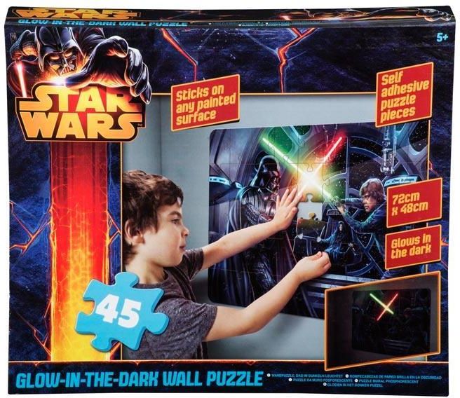 Zestaw zawiera 45 ogromnych puzzli z grafiką ze świata Gwiezdnych Wojen. Puzzle można układać tradycyjnie lub przyklejając je do ściany. Można w ten sposób stworzyć efektowną dekorację bo puzzle świecą w ciemności. Obrazek przedstawia walkę Luka Skywalkera z Darthem Vaderem - ostateczne starcie dobra ze złem w oryginalnej trylogii. Puzzle mocujemy do ściany, przyklejając je po odklejeniu papierków zabezpieczających. Wymiary obrazka po ułożeniu: 72 x 48 cm