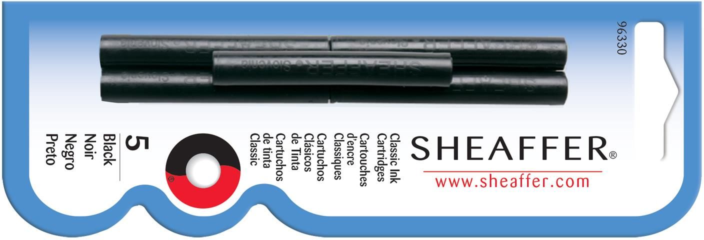 Naboje do piór wiecznych Sheaffer Classic CzarneNaboje do piór wiecznych Sheaffer Classic (w blistrze) - czarne. Naboje odpowiednie dla wszystkich piór wiecznych poza modelem VFM. Zestaw Sheaffer zawiera 5 szt. nabojów. Naboje dostępne w kolorach: niebieskie, granatowe, czarne, czerwone, różowe, pomarańczowe, fioletowe, zielone, brązowe, turkusowe, złote, mieszane (5 różnych kolorów).
