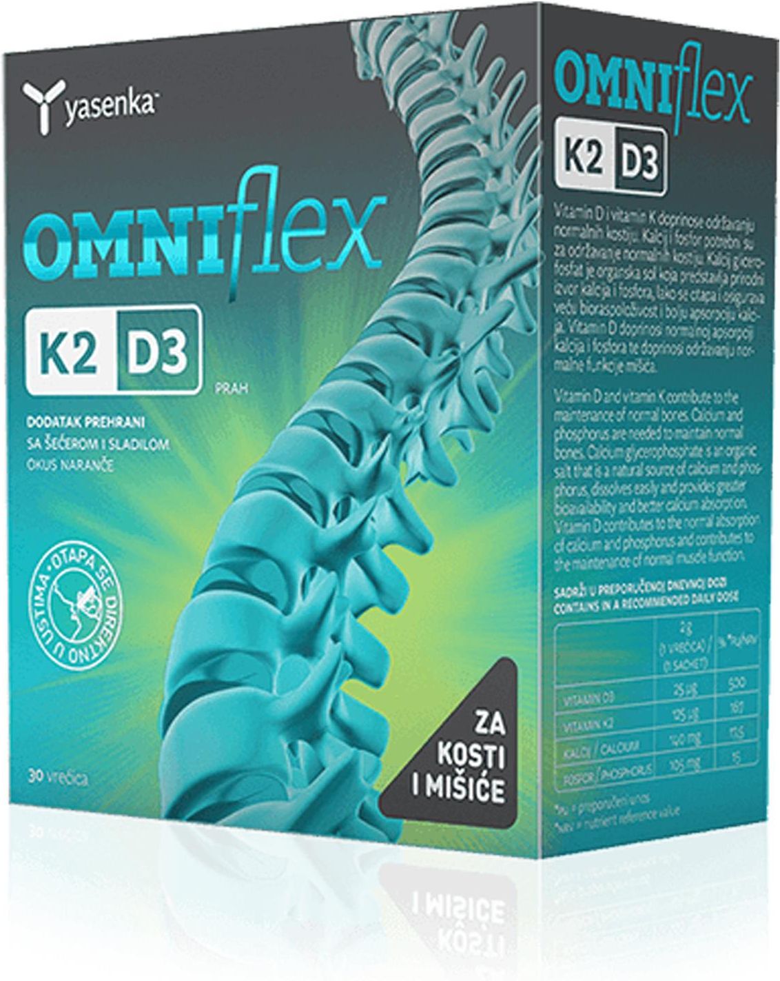 Omniflex K2D3 Powder to suplement diety zawierający witaminy K2 i D3. Korzyści płynące ze stosowania witaminy D są dobrze znane, ale często pomija się fakt, że witamina D potrzebuje witaminy K2, aby zmaksymalizować swoje działanie. Preparat ten wspomaga wchłanianie wapnia i zapewnia jego prawidłową dystrybucję tam, gdzie jest najbardziej potrzebny - do zdrowych kości, mięśni i stawów. Witamina D i witamina K przyczyniają się do utrzymania prawidłowych funkcji kości. Wapń i fosfor są również niezbędne dla zdrowych kości i stawów. Glicerofosforan wapnia jest solą organiczną, która służy jako naturalne źródło wapnia i fosforu, jest łatwo rozpuszczalna i zapewnia większą biodostępność i lepsze wchłanianie wapnia. Witamina D pomaga w prawidłowym wchłanianiu wapnia i fosforu oraz przyczynia się do utrzymania prawidłowego funkcjonowania mięśni. Dla zdrowia kości i stawów oraz poprawy mobilności, witamina K2 w połączeniu z D3, po prostu K2D3. Zalecane dawkowanie Zalecana dawka to jedna saszetka dziennie. Zawartość saszetki należy rozpuścić bezpośrednio w jamie ustnej bez popijania płynem. UWAGI Produkt należy przechowywać w miejscu niedostępnym dla małych dzieci. Nie należy przekraczać zalecanej dziennej dawki. Suplementy diety nie zastępują zbilansowanej diety. Zrównoważona i zróżnicowana dieta oraz zdrowy tryb życia są ważne dla zdrowia. WARUNKI PRZECHOWYWANIA Produkt należy przechowywać w temperaturze do 25°C w suchym miejscu. WAGA 60 g (30 saszetek x 2 g) INCI: Dextrose; calcium glycerophosphate; orange flavor; acidity regulator: citric acid; menaquinone; cholecalciferol; anti-caking agent: magnesium stearate; sweetener: steviol glycosides. Contains in recommended dose. In one bag. %*PUVitamin D325 µg500Vitamin K2125 µg167Calcium140 mg17,5Phosphorus105 mg15