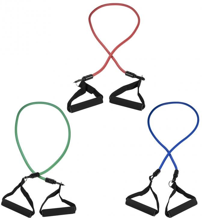Zestaw ekspanderów fitness! Szczegóły : 2 uchwyty: długość uchwytu 12 cm,średnica uchwytu 2,5 cm 3 taśmy: długość ok. 117 cm każda, średnica 1,2 cm 3 różne poziomy oporu: niebieski - lekki, czerwony - średni, zielony - duży W komplecie praktyczna torba do przechowywania Uchwyty wykonane z pianki …