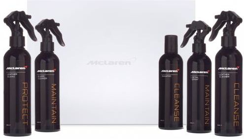 Zestaw kosmetyków Mclaren Car Care Kit Oficjalnie zatwierdzony i stosowany przez McLaren Automotive w McLaren Technology Center. McLaren Cleanse Shampoo McLaren Cleanse Leather Cleaner McLaren Maintain Glass Cleaner McLaren Maintain Detail Spray McLaren Protect Leather Guard Pojemność 5 x 250 ml